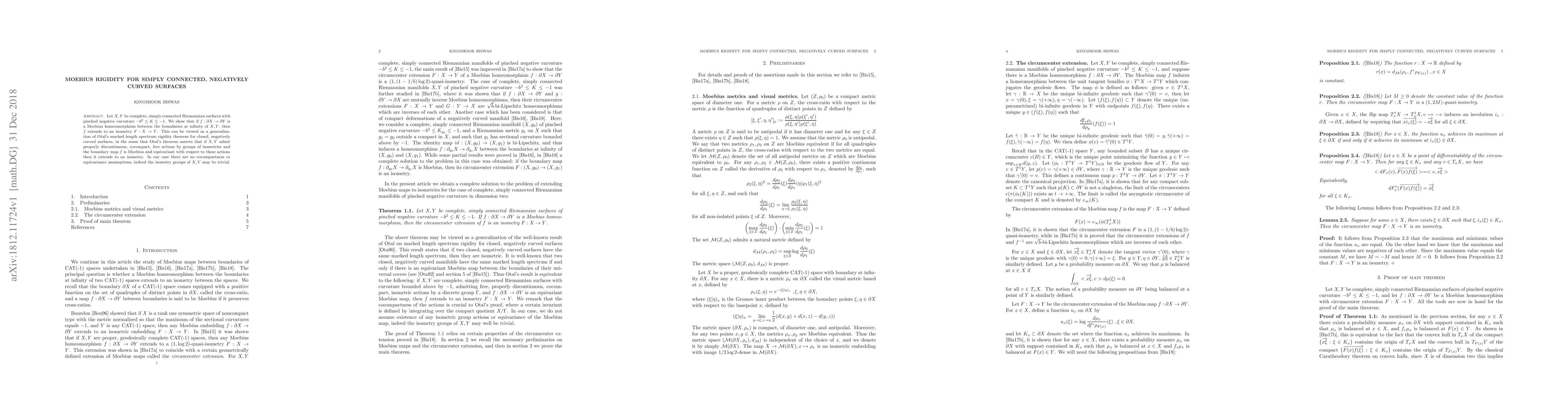 This research proves that Moebius homeomorphisms between the boundaries at infinity of complete, simply connected Riemannian surfaces with pinched negative curvature extend to isometries, generalizing Otal's marked length spectrum rigidity theorem. The key finding is that no cocompactness or equivariance assumptions are needed, allowing isometry groups of X and Y to be trivial.