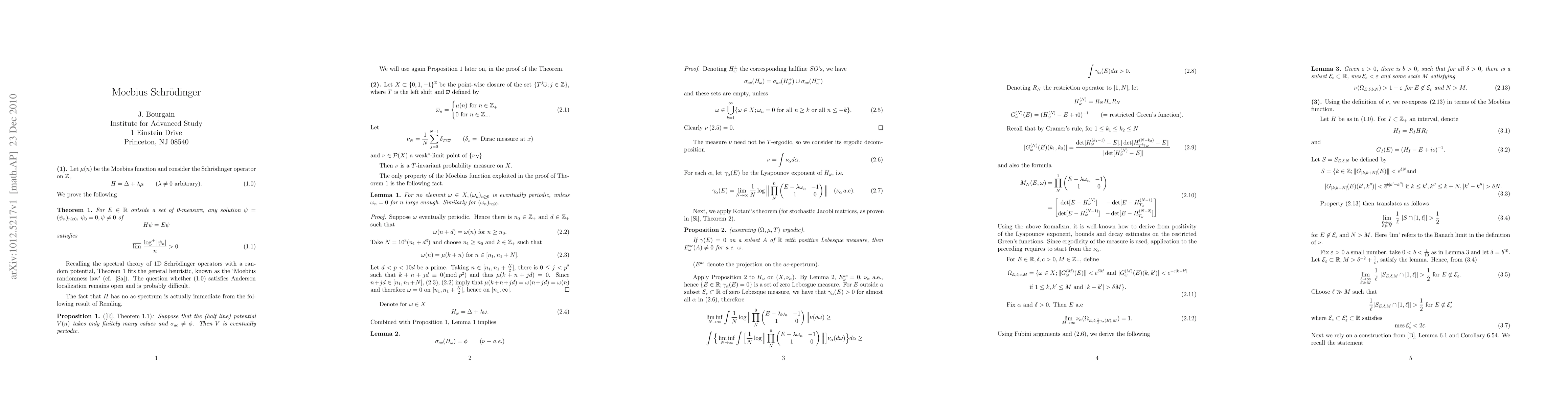 Summary: The research demonstrates that a 1-dimensional lattice Schrödinger operator with a potential proportional to the Moebius function exhibits a positive Lyapounov exponent, indicating a new instance of the Moebius randomness law in the context of classical random Schrödinger operators.