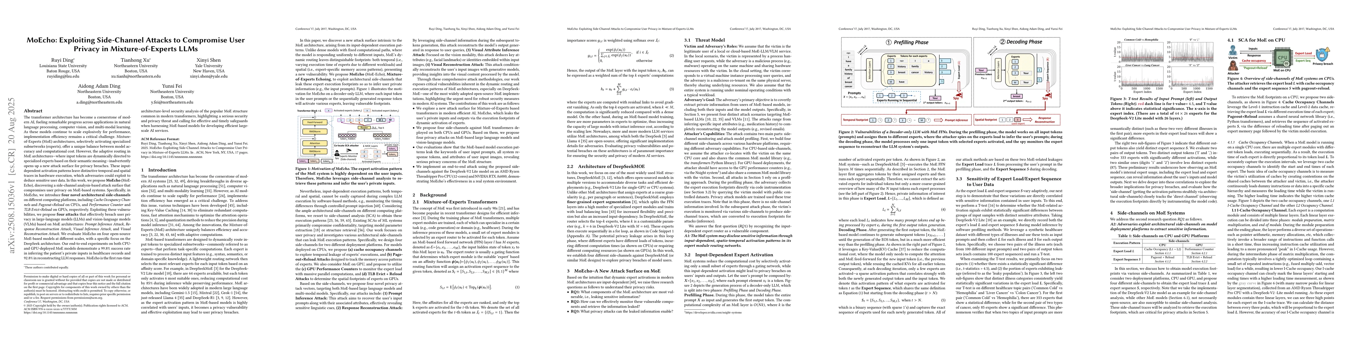 The transformer architecture has become a cornerstone of modern AI, fueling remarkable progress across applications in natural language processing, computer vision, and multimodal learning. As these models continue to scale explosively for performance, implementation efficiency remains a critical challenge. Mixture of Experts (MoE) architectures, selectively activating specialized subnetworks (experts), offer a unique balance between model accuracy and computational cost. However, the adaptive routing in MoE architectures, where input tokens are dynamically directed to specialized experts based on their semantic meaning inadvertently opens up a new attack surface for privacy breaches. These input-dependent activation patterns leave distinctive temporal and spatial traces in hardware execution, which adversaries could exploit to deduce sensitive user data. In this work, we propose MoEcho, discovering a side channel analysis based attack surface that compromises user privacy on MoE based systems. Specifically, in MoEcho, we introduce four novel architectural side channels on different computing platforms, including Cache Occupancy Channels and Pageout+Reload on CPUs, and Performance Counter and TLB Evict+Reload on GPUs, respectively. Exploiting these vulnerabilities, we propose four attacks that effectively breach user privacy in large language models (LLMs) and vision language models (VLMs) based on MoE architectures: Prompt Inference Attack, Response Reconstruction Attack, Visual Inference Attack, and Visual Reconstruction Attack. MoEcho is the first runtime architecture level security analysis of the popular MoE structure common in modern transformers, highlighting a serious security and privacy threat and calling for effective and timely safeguards when harnessing MoE based models for developing efficient large scale AI services.