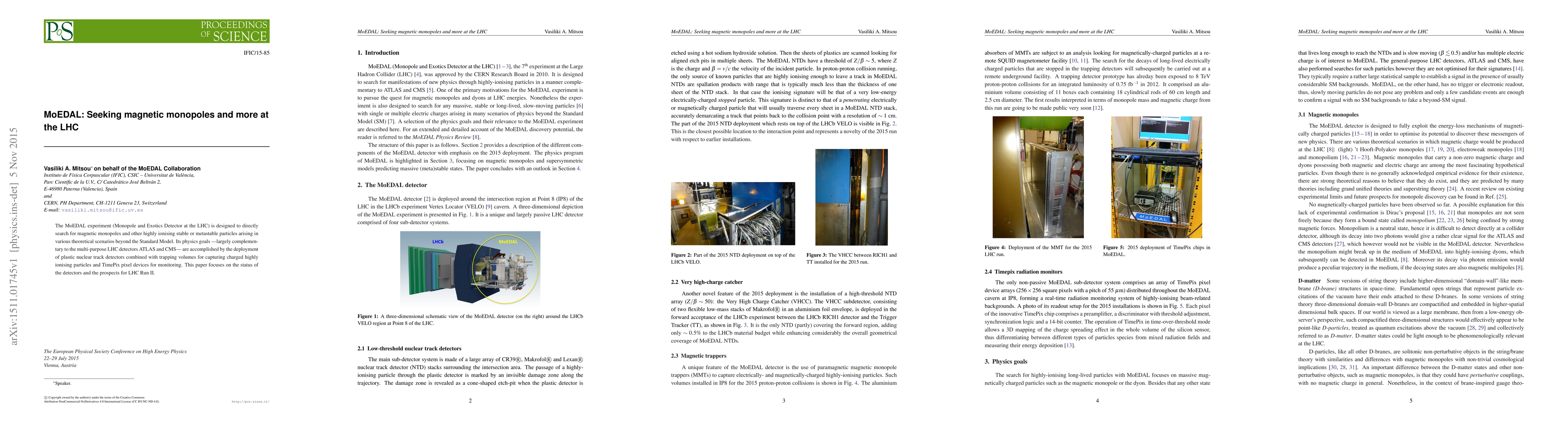 The MoEDAL experiment aims to detect magnetic monopoles and other exotic particles using plastic nuclear track detectors and trapping volumes, complementing the LHC's ATLAS and CMS detectors. Its current status and future prospects for LHC Run II are discussed.