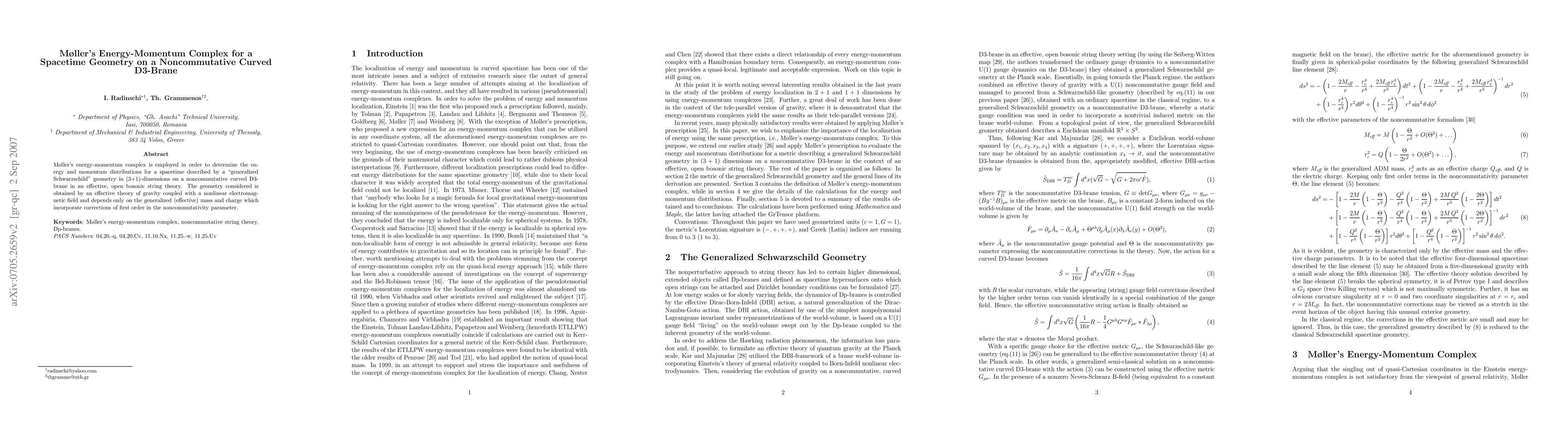 Moeller's energy-momentum complex is used to analyze energy and momentum distributions in a (3+1)-dimensional "generalized Schwarzschild" spacetime on a noncommutative curved D3-brane, incorporating first-order noncommutativity corrections. The geometry is derived from an effective theory combining gravity and a nonlinear electromagnetic field.