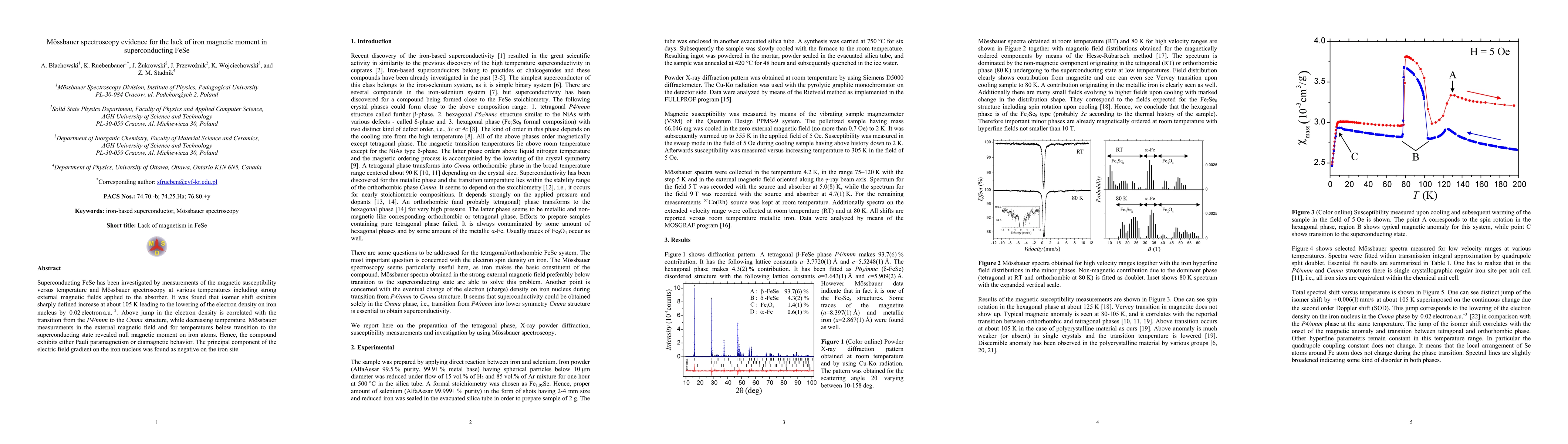 Researchers used Moessbauer spectroscopy to study iron in superconducting FeSe, finding no magnetic moment at temperatures above 105K, suggesting Pauli paramagnetism or diamagnetic behavior.