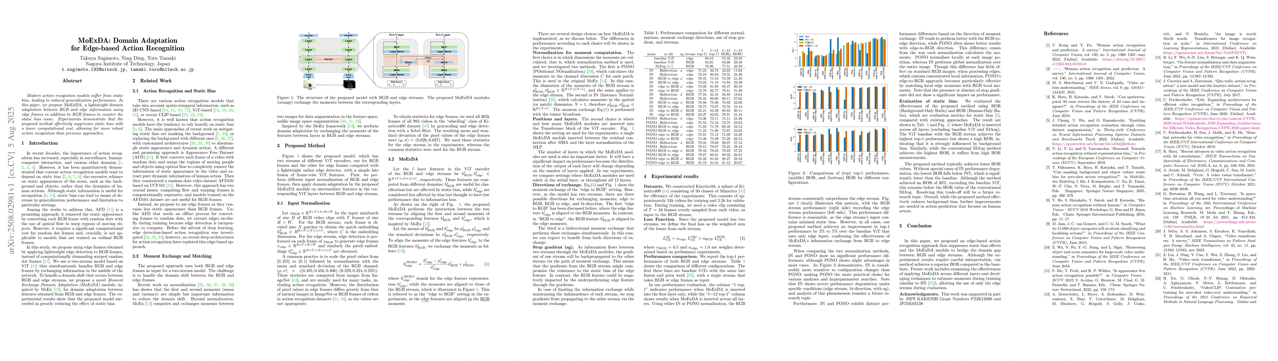 Modern action recognition models suffer from static bias, leading to reduced generalization performance. In this paper, we propose MoExDA, a lightweight domain adaptation between RGB and edge information using edge frames in addition to RGB frames to counter the static bias issue. Experiments demonstrate that the proposed method effectively suppresses static bias with a lower computational cost, allowing for more robust action recognition than previous approaches.