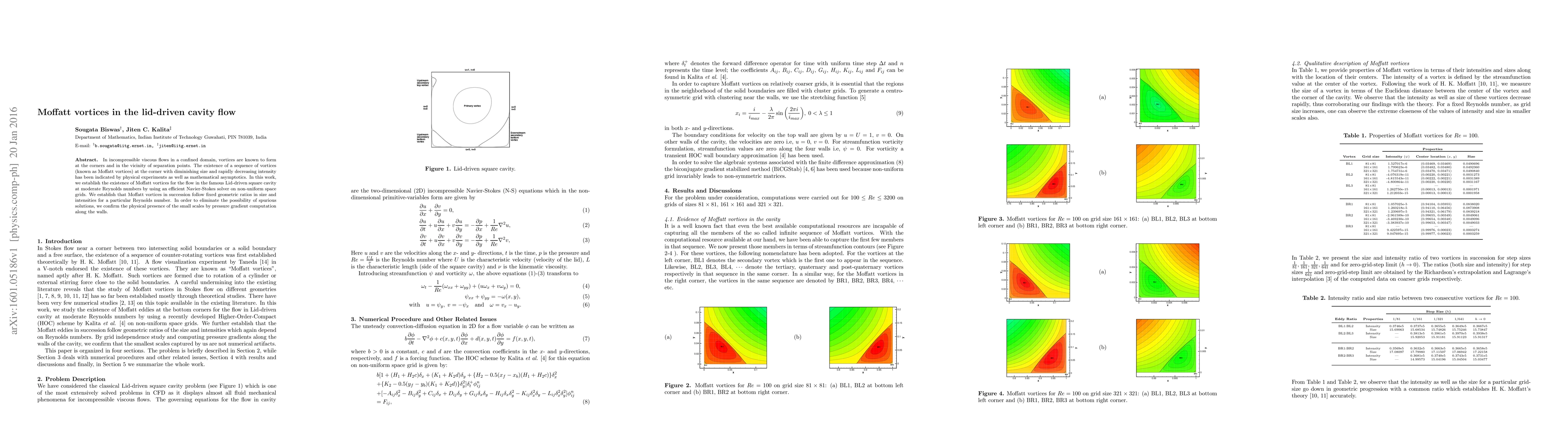 This study confirms the existence of Moffatt vortices in the lid-driven square cavity flow using a Navier-Stokes solver, demonstrating that these vortices follow fixed geometric ratios in size and intensity at moderate Reynolds numbers. Pressure gradient computations validate the physical presence of these small-scale vortices.