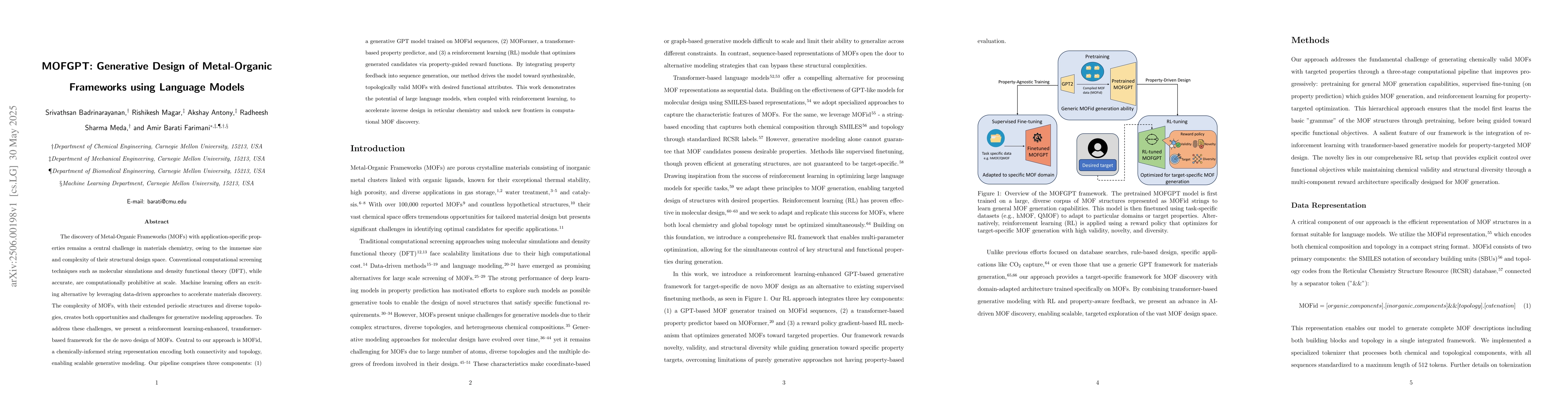 This work is novel in its application of transformer-based language models and reinforcement learning to the generative design of MOFs, introducing MOFid representation for scalable modeling.