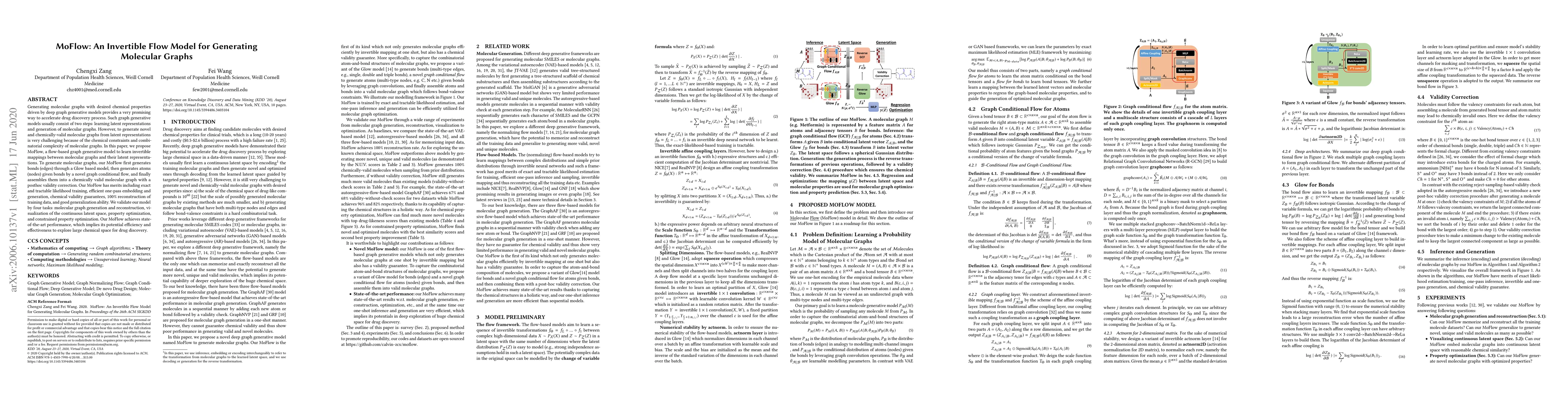 MoFlow is an invertible flow model for generating chemically valid molecular graphs, leveraging a Glow-based approach for bond generation followed by a conditional flow for atom placement. It demonstrates state-of-the-art performance in molecular graph generation, reconstruction, and property optimization, promising enhanced drug discovery efficiency.