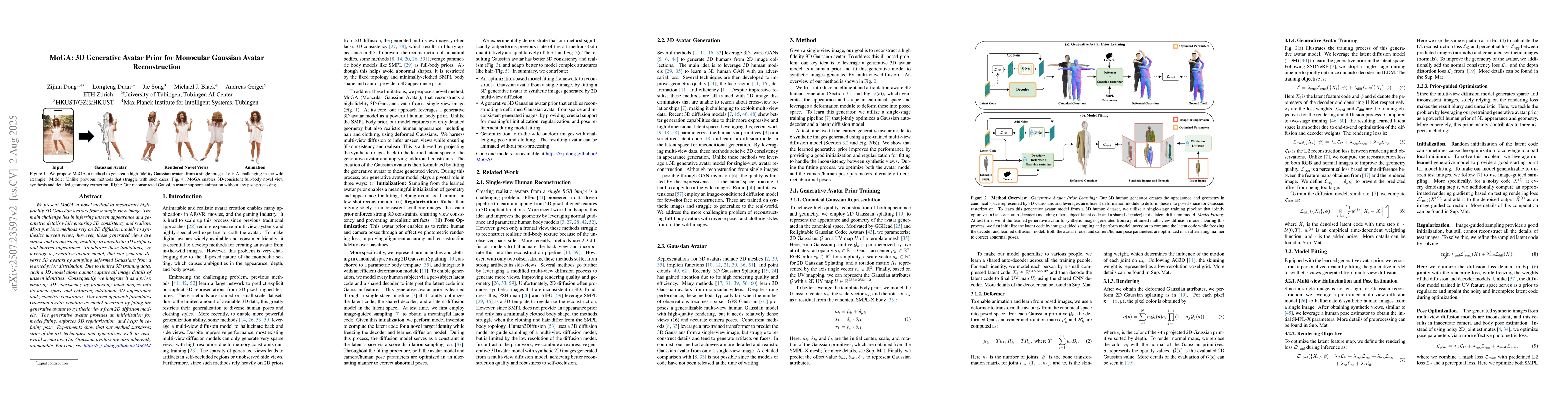 We present MoGA, a novel method to reconstruct high-fidelity 3D Gaussian avatars from a single-view image. The main challenge lies in inferring unseen appearance and geometric details while ensuring 3D consistency and realism. Most previous methods rely on 2D diffusion models to synthesize unseen views; however, these generated views are sparse and inconsistent, resulting in unrealistic 3D artifacts and blurred appearance. To address these limitations, we leverage a generative avatar model, that can generate diverse 3D avatars by sampling deformed Gaussians from a learned prior distribution. Due to the limited amount of 3D training data such a 3D model alone cannot capture all image details of unseen identities. Consequently, we integrate it as a prior, ensuring 3D consistency by projecting input images into its latent space and enforcing additional 3D appearance and geometric constraints. Our novel approach formulates Gaussian avatar creation as a model inversion process by fitting the generative avatar to synthetic views from 2D diffusion models. The generative avatar provides a meaningful initialization for model fitting, enforces 3D regularization, and helps in refining pose estimation. Experiments show that our method surpasses state-of-the-art techniques and generalizes well to real-world scenarios. Our Gaussian avatars are also inherently animatable