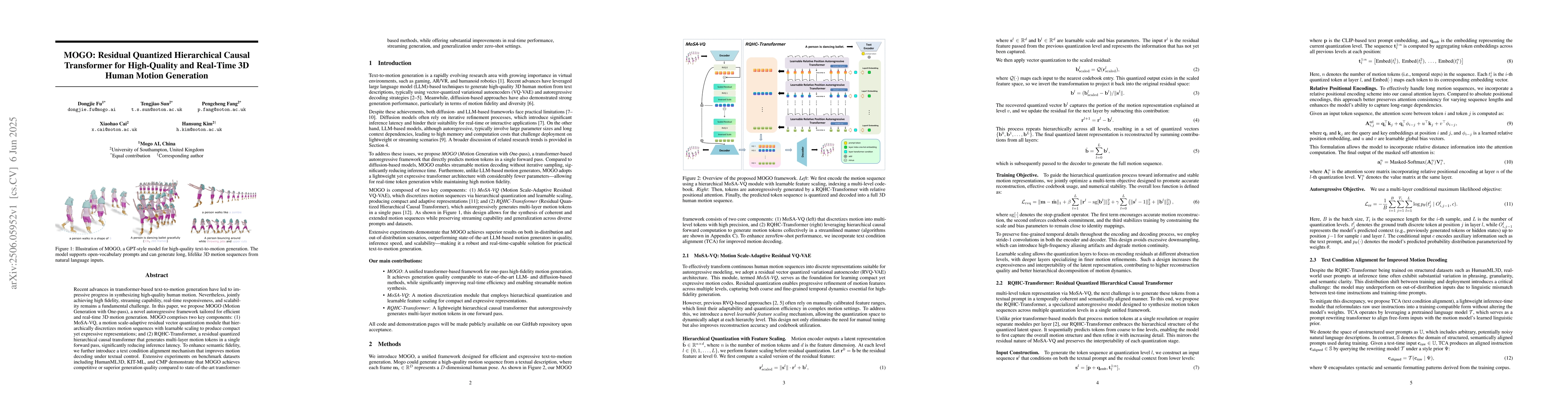 Recent advances in transformer-based text-to-motion generation have led to impressive progress in synthesizing high-quality human motion. Nevertheless, jointly achieving high fidelity, streaming capability, real-time responsiveness, and scalability remains a fundamental challenge. In this paper, we propose MOGO (Motion Generation with One-pass), a novel autoregressive framework tailored for efficient and real-time 3D motion generation. MOGO comprises two key components: (1) MoSA-VQ, a motion scale-adaptive residual vector quantization module that hierarchically discretizes motion sequences with learnable scaling to produce compact yet expressive representations; and (2) RQHC-Transformer, a residual quantized hierarchical causal transformer that generates multi-layer motion tokens in a single forward pass, significantly reducing inference latency. To enhance semantic fidelity, we further introduce a text condition alignment mechanism that improves motion decoding under textual control. Extensive experiments on benchmark datasets including HumanML3D, KIT-ML, and CMP demonstrate that MOGO achieves competitive or superior generation quality compared to state-of-the-art transformer-based methods, while offering substantial improvements in real-time performance, streaming generation, and generalization under zero-shot settings.