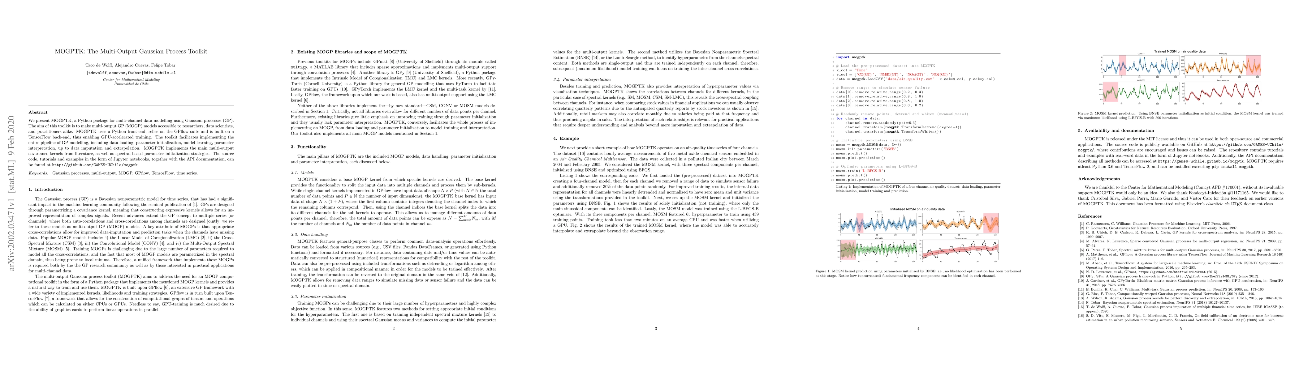 MOGPTK is a Python package for multi-output Gaussian process modelling, utilizing TensorFlow for GPU-accelerated training. It provides comprehensive tools for the entire GP modelling pipeline, including data handling, model learning, and parameter interpretation.