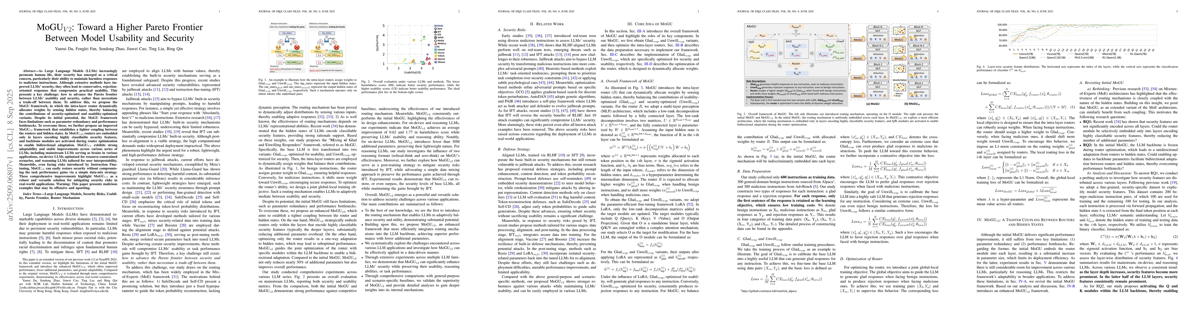 As Large Language Models (LLMs) increasingly permeate human life, their security has emerged as a critical concern, particularly their ability to maintain harmless responses to malicious instructions. Although extensive methods have improved LLMs' security, they often lead to conservative, rejection-oriented responses that compromise practical usability. This presents a key challenge: how to advance the Pareto frontier between LLMs' usability and security, rather than necessitate a trade-off between them. To address this, we propose the MoGU framework, in which the intra-layer router dynamically allocates weights by sensing hidden states, thereby balancing the contributions of security-optimized and usability-optimized variants. Despite its initial potential, the MoGU framework faces limitations such as parameter redundancy and performance bottlenecks. To overcome these, we further propose an improved MoGU_v2 framework that establishes a tighter coupling between the routers and hidden states. In MoGU_v2, routers are embedded only in layers encoding highly classifiable security features, and backbone modules are activated during router optimization to enable bidirectional adaptation. MoGU_V2 exhibits strong adaptability and stable improvements across various series of LLMs, including mainstream LLMs serving as brains in various applications, on-device LLMs optimized for resource-constrained scenarios, and reasoning LLMs tailored for user interpretability. Meanwhile, even facing risks introduced by Instruction Fine-tuning, MoGU_v2 can easily restore security without compromising the task performance gains via a simple data-mix strategy. These comprehensive improvements highlight MoGU_V2 as a robust and versatile solution for mitigating security risks in real-world applications.