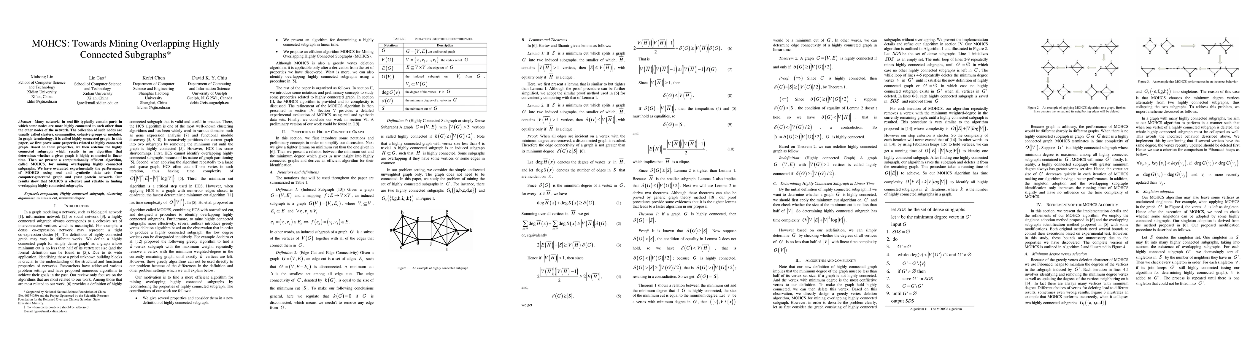 The novelty of this work lies in the tighter Lemma 2, the new definition of highly connected graphs based on minimum degree, and the linear-time algorithm MOHCS for mining overlapping highly connected subgraphs.