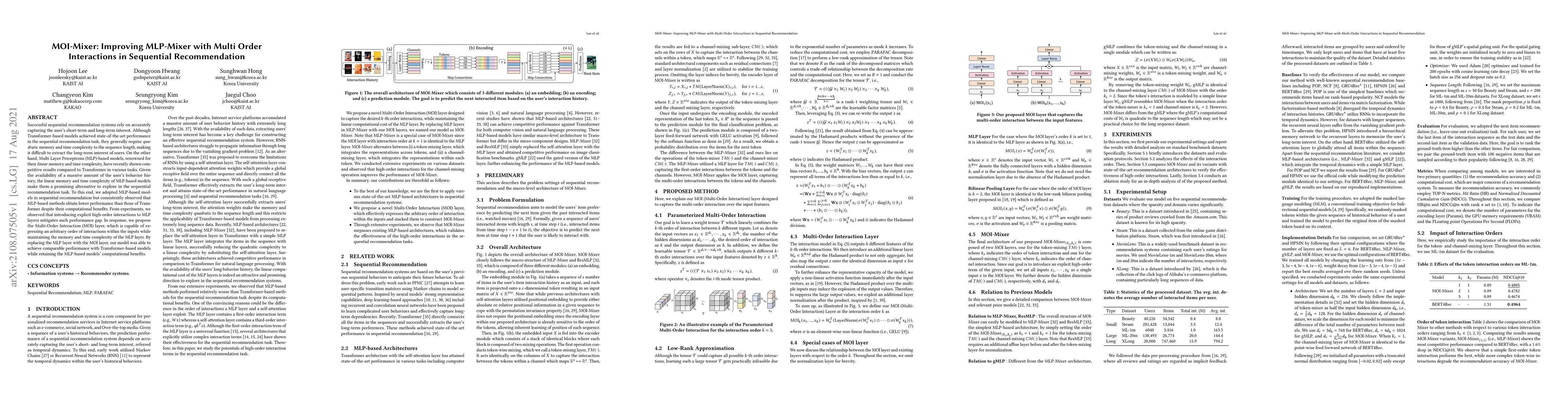 The paper proposes the Multi-Order Interaction (MOI) layer to enhance MLP-Mixer models for sequential recommendation, addressing the performance gap compared to Transformer-based models. The MOI layer captures high-order interactions within inputs, achieving comparable performance to Transformers while maintaining the computational efficiency of MLP-based models.