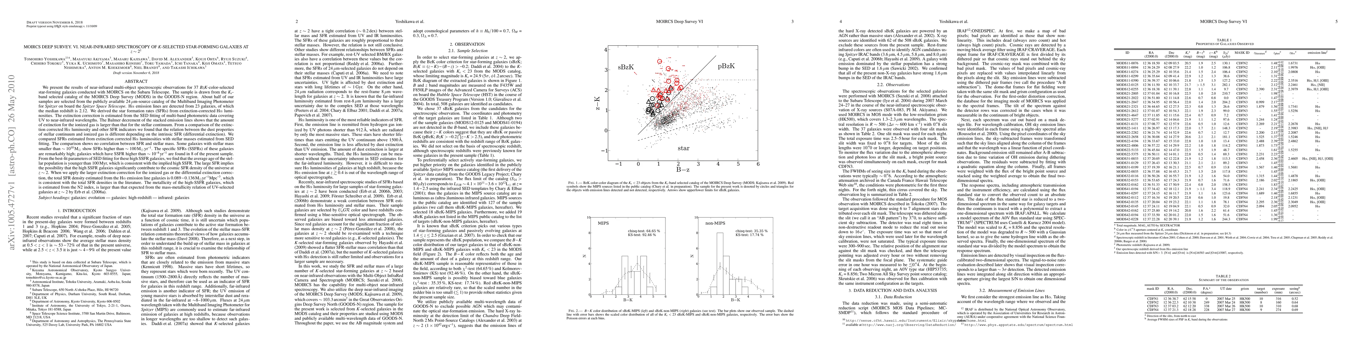 We present near-infrared (NIR) spectroscopy for 37 BzK-color-selected star-forming galaxies with MOIRCS on Subaru. The sample is drawn from the Ks-band selected catalog of the MOIRCS Deep Survey (MODS) in the GOODS-N region. About half of our samples are selected from the MIPS 24um-source catalog. Ha emission lines are detected from 23 galaxies, of which the median redshift is 2.12. We derived the star formation rates (SFRs) from extinction-corrected Ha luminosities. The extinction correction is estimated from the SED fitting of multi-band photometric data covering UV to NIR wavelengths. The Balmer decrement of the stacked emission lines shows that the amount of extinction for the ionized gas is larger than that for the stellar continuum. From a comparison of the extinction corrected Ha luminosity and other SFR indicators we found that the relation between the dust properties of stellar continuum and ionized gas is different depending on the intrinsic SFR. The comparison between the Ha SFR and stellar mass estimated from SED fitting shows no correlation between them. Some galaxies with stellar mass smaller than ~10^10 Msun show SFRs higher than ~100 Msun/yr. The specific SFRs (SSFRs) of these galaxies are remarkably high. The average stellar-population age of these high-SSFR galaxies is younger than 100 Myr, which is consistent with the implied high SSFR. The large SFR implies the possibility that the high SSFR galaxies significantly contribute to the cosmic SFR density of the universe at z~2. The total SFR density estimated from the Ha emission line galaxies is 0.089-0.136 Msun/yr/Mpc^3, which is consistent with the total SFR densities in the literature. The metallicity of the high-SSFR galaxies is larger than that expected from the mass-metallicity relation of UV-selected galaxies at z~2 by Erb et al. (2006a). [Abridged]