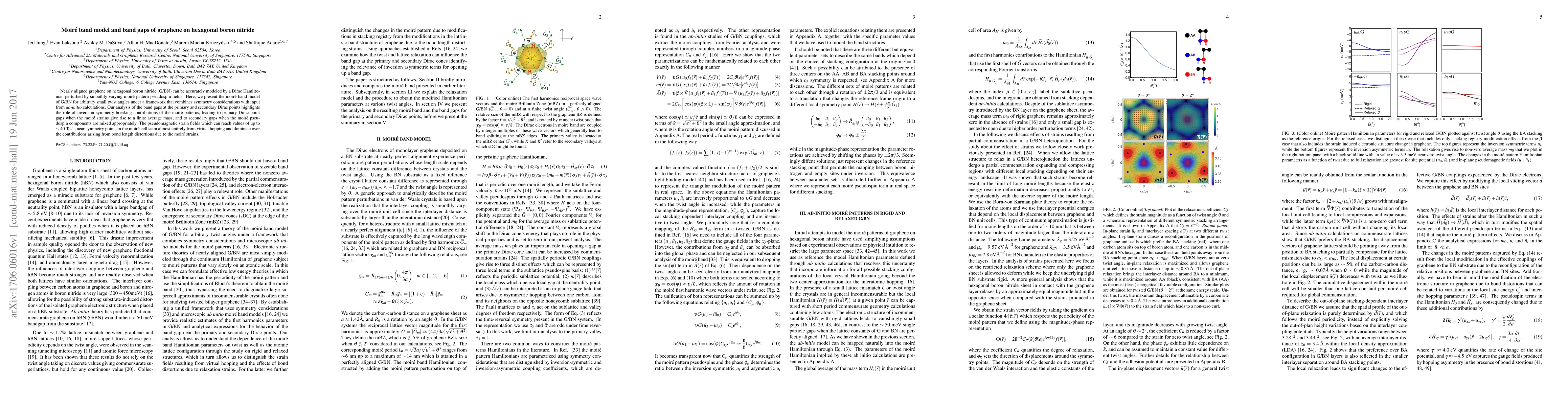 Nearly aligned graphene on hexagonal boron nitride (G/BN) can be accurately modeled by a Dirac Hamiltonian perturbed by smoothly varying moir\'e pattern pseudospin fields. Here, we present the moir\'e-band model of G/BN for arbitrary small twist angles under a framework that combines symmetry considerations with input from ab-initio calculations. Our analysis of the band gaps at the primary and secondary Dirac points highlights the role of inversion symmetry breaking contributions of the moir\'e patterns, leading to primary Dirac point gaps when the moir\'e strains give rise to a finite average mass, and to secondary gaps when the moir\'e pseudospin components are mixed appropriately. The pseudomagnetic strain fields which can reach values of up to $\sim$40 Tesla near symmetry points in the moir\'e cell stem almost entirely from virtual hopping and dominate over the contributions arising from bond length distortions due to the moir\'e strains.
