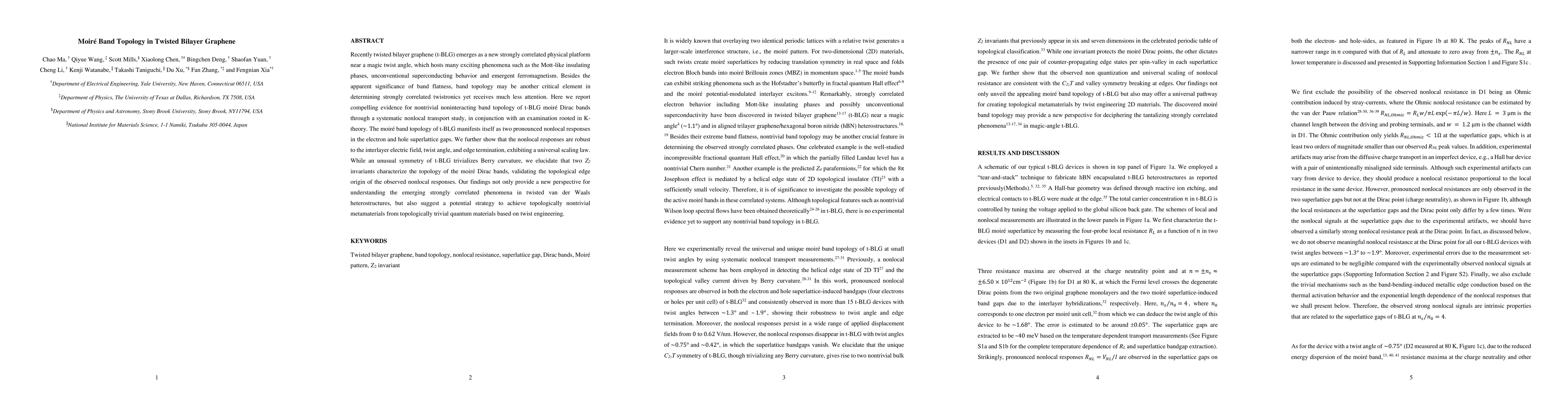 This paper investigates the nontrivial topological properties of moiré Dirac bands in twisted bilayer graphene (t-BLG), demonstrating their presence through nonlocal transport studies and $K$-theory analysis. The study reveals robust nonlocal responses in the electron and hole superlattice gaps, characterized by two $Z_2$ invariants, suggesting potential for developing topologically nontrivial metamaterials via twist engineering.
