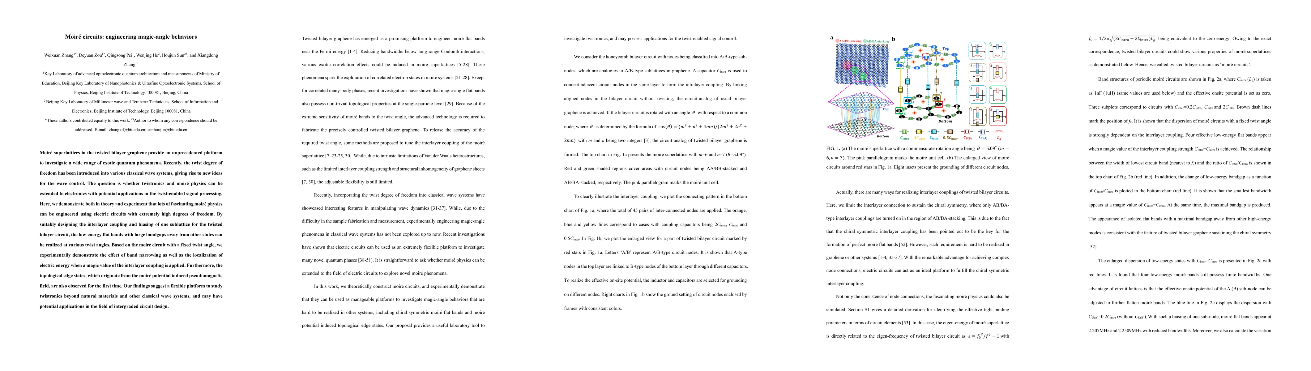 This paper demonstrates that moiré physics, typically seen in twisted bilayer graphene, can be replicated in electric circuits, enabling the engineering of low-energy flat bands and topological edge states. Experimental results show band narrowing and localization of electric energy, suggesting potential applications in integrated circuit design.