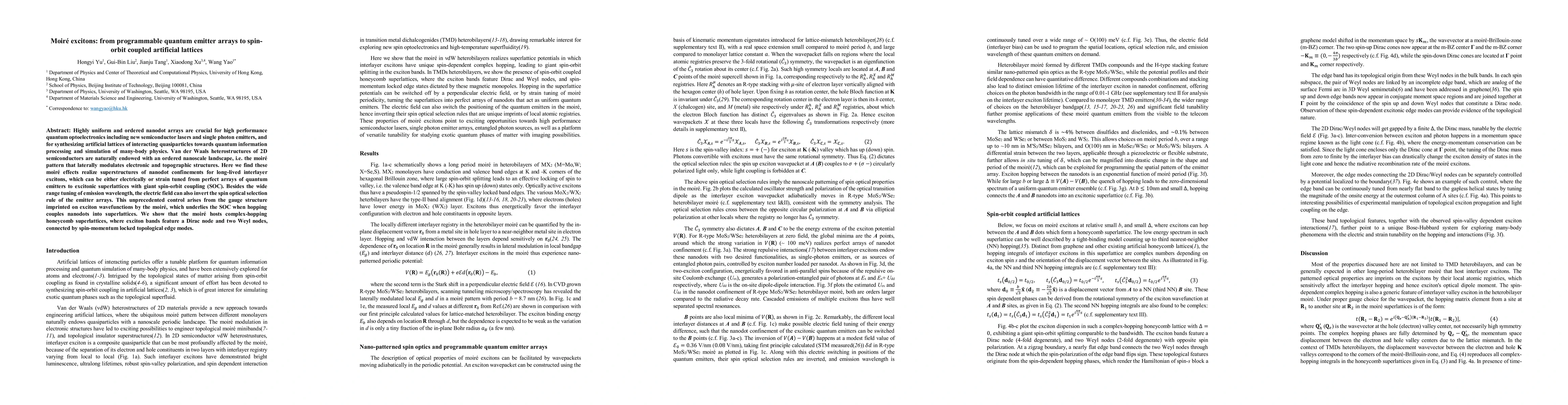 The research introduces moiré excitons in 2D semiconductor van der Waals heterostructures, demonstrating control over quantum emitter arrays via electric fields and strain. These moiré effects create superstructures of nanodot confinements for long-lived interlayer excitons, enabling tuning from quantum emitter arrays to excitonic superlattices with strong spin-orbit coupling. The moiré pattern imparts a gauge structure on exciton wavefunctions, leading to complex-hopping honeycomb superlattices with unique topological edge modes.