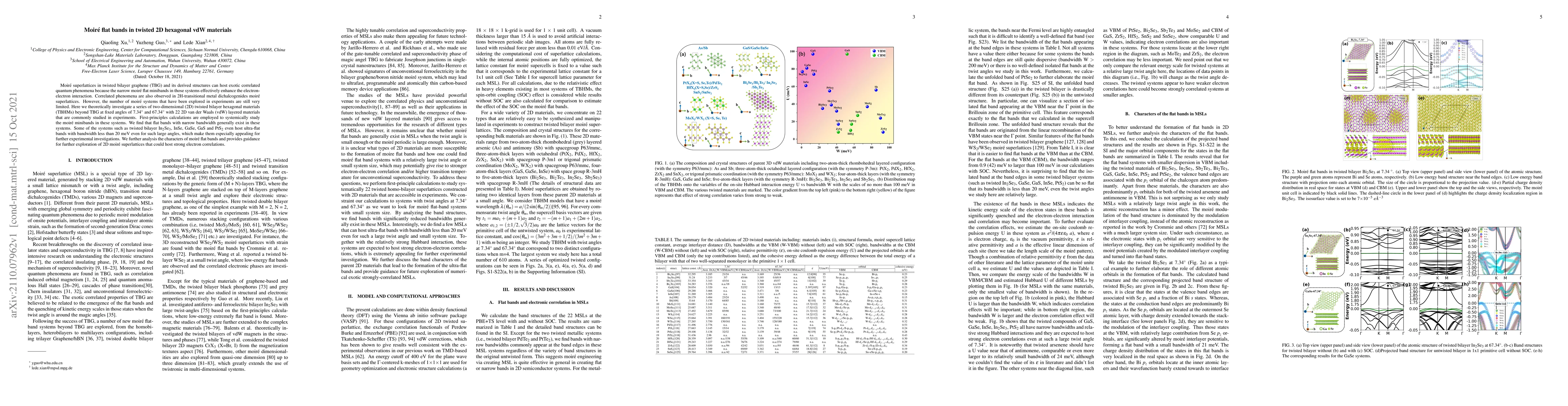 Moire superlattices in twisted bilayer graphene (TBG) and its derived structures can host exotic correlated quantum phenomena because the narrow moire flat minibands in those systems effectively enhance the electron-electron interaction. Correlated phenomena are also observed in 2H-transitional metal dichalcogenides moire superlattices. However, the number of moire systems that have been explored in experiments are still very limited. Here we theoretically investigate a series of two-dimensional (2D) twisted bilayer hexagonal materials (TBHMs) beyond TBG at fixed angles of 7.34 and 67.34 degree with 22 2D van der Waals (vdW) layered materials that are commonly studied in experiments. First-principles calculations are employed to systemically study the moire minibands in these systems. We find that flat bands with narrow bandwidth generally exist in these systems. Some of the systems such as twisted bilayer In2Se3, InSe, GaSe, GaS and PtS2 even host ultra-flat bands with bandwidth less than 20 meV even for such large angles, which make them especially appealing for further experimental investigations. We further analysis the characters of moire flat bands and provides guidance for further exploration of 2D moire superlattices that could host strong electron correlations.