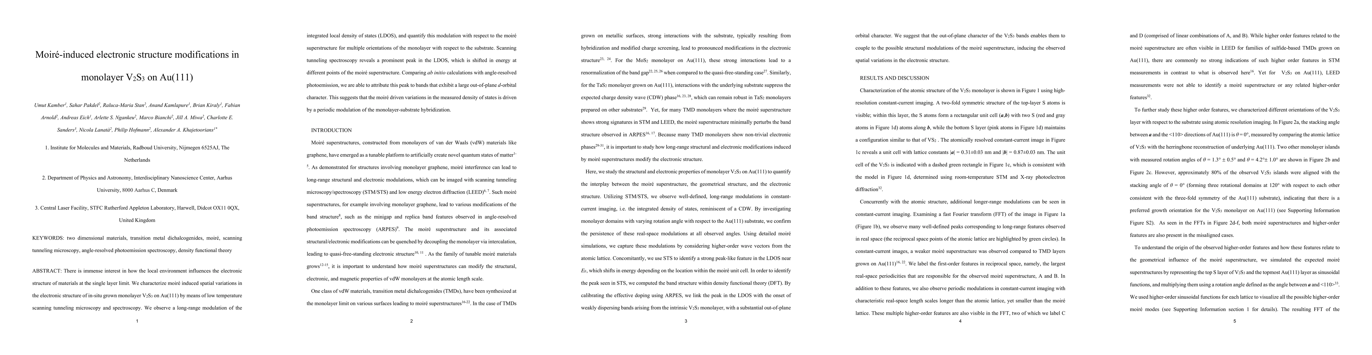 There is immense interest in how the local environment influences the electronic structure of materials at the single layer limit. We characterize moir\'e induced spatial variations in the electronic structure of in-situ grown monolayer V2S3 on Au(111) by means of low temperature scanning tunneling microscopy and spectroscopy. We observe a long-range modulation of the integrated local density of states (LDOS), and quantify this modulation with respect to the moir\'e superstructure for multiple orientations of the monolayer with respect to the substrate. Scanning tunneling spectroscopy reveals a prominent peak in the LDOS, which is shifted in energy at different points of the moir\'e superstructure. Comparing ab initio calculations with angle-resolved photoemission, we are able to attribute this peak to bands that exhibit a large out-of-plane d-orbital character. This suggests that the moir\'e driven variations in the measured density of states is driven by a periodic modulation of the monolayer-substrate hybridization.