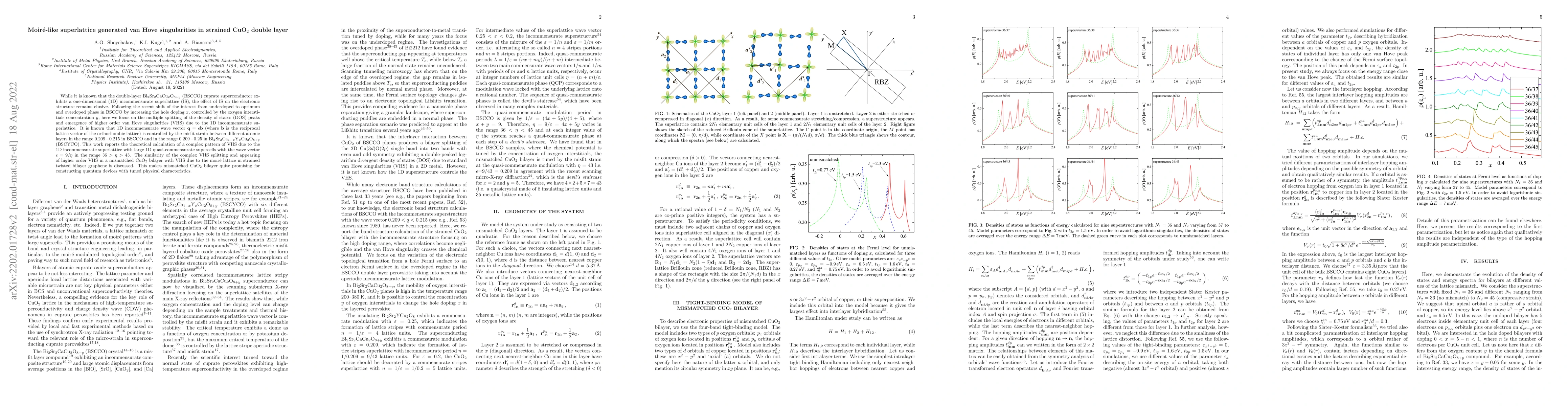 This paper investigates the electronic structure of strained CuO$_2$ double layers in BSCCO superconductors, revealing the emergence of higher order van Hove singularities due to a one-dimensional incommensurate superlattice. The study finds similarities between the resulting complex splitting of density of states and the moiré-like patterns in twisted bilayer graphene, suggesting potential for quantum device applications.