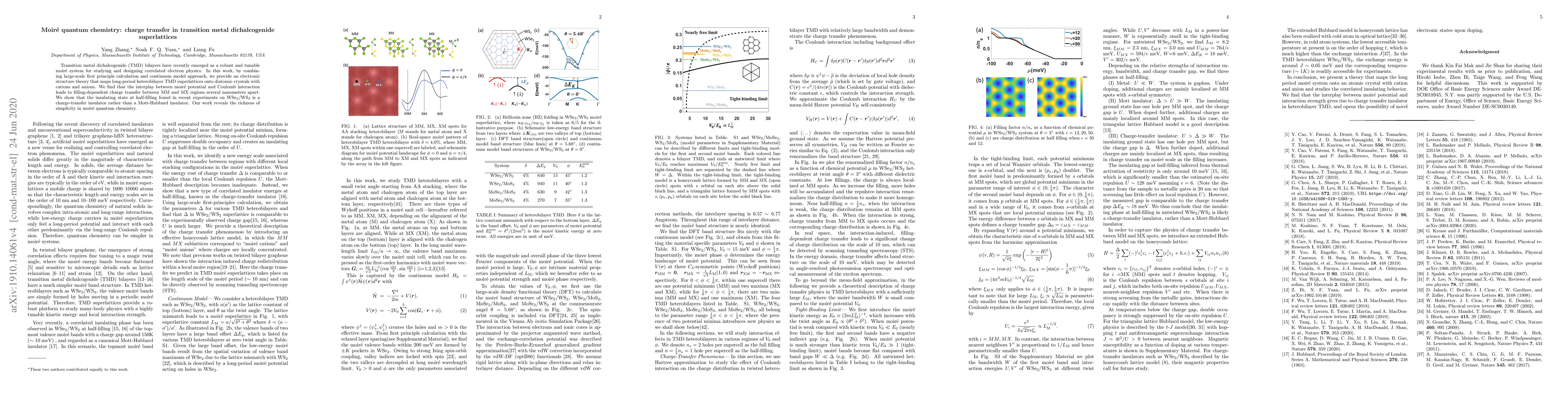 Transition metal dichalcogenide (TMD) bilayers have recently emerged as a robust and tunable moir\'e system for studying and designing correlated electron physics. In this work, by combining large-scale first principle calculation and continuum model approach, we provide an electronic structure theory that maps long-period heterobilayer TMD superlattices onto diatomic crystals with cations and anions. We find that the interplay between moir\'e potential and Coulomb interaction leads to filling-dependent charge transfer between MM and MX regions several nanometers apart. We show that the insulating state at half-filling found in recent experiments on WSe$_2$/WS$_2$ is a charge-transfer insulator rather than a Mott-Hubbard insulator. Our work reveals the richness of simplicity in moir\'e quantum chemistry.