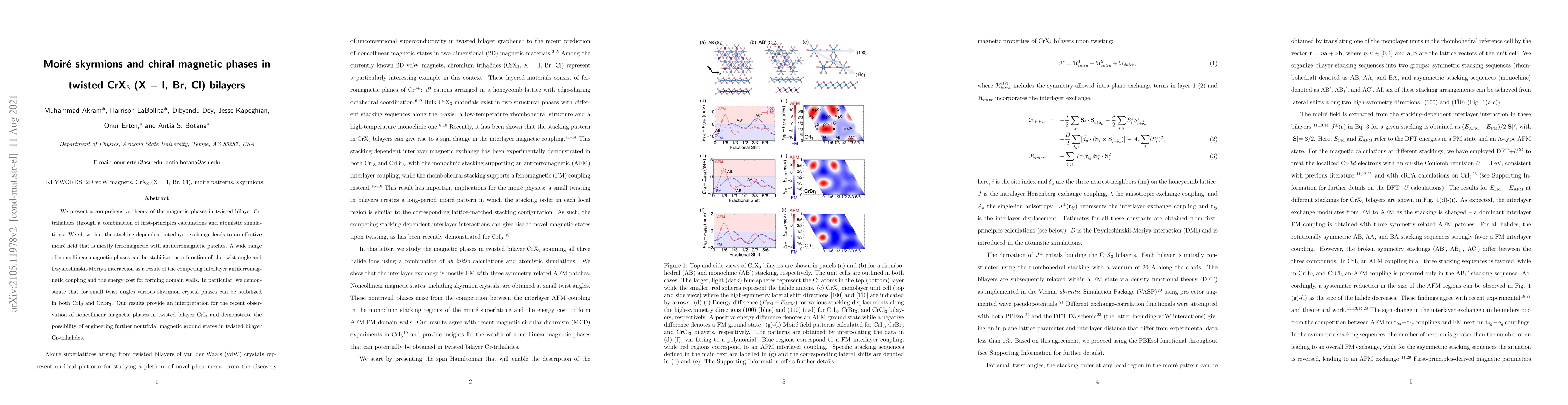 This paper presents a theoretical framework for understanding magnetic phases in twisted bilayer CrX$_3$ (X = I, Br, Cl) trihalides, revealing that interlayer exchange creates a moir\'e field leading to diverse noncollinear magnetic phases, including skyrmion crystals, influenced by twist angles and Dzyaloshinskii-Moriya interactions. The findings explain recent observations of noncollinear magnetic phases and suggest potential for engineering new magnetic states in these materials.