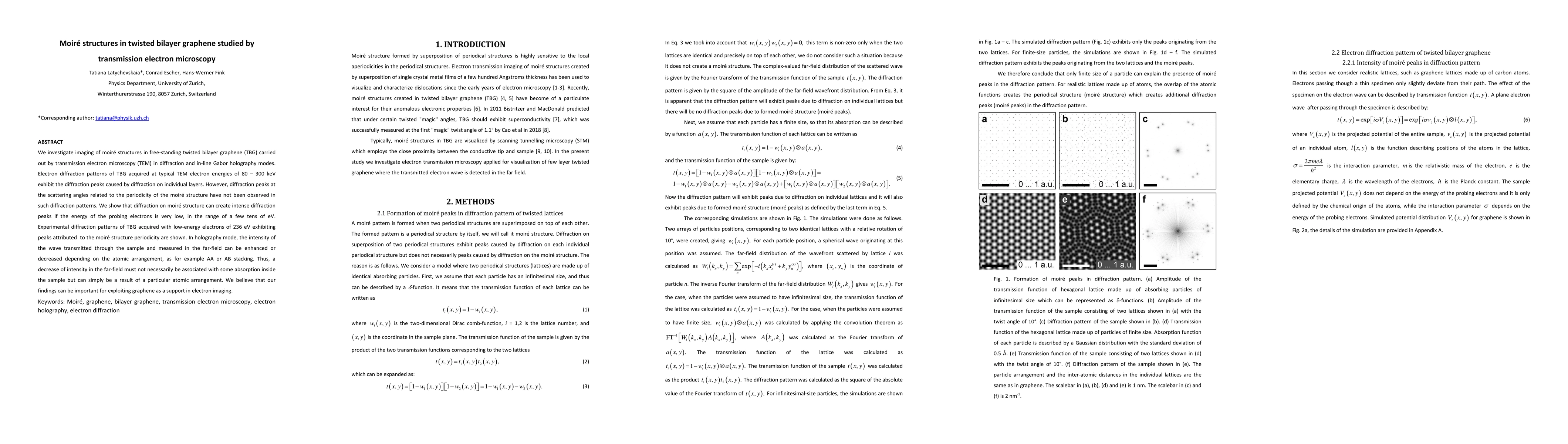 This study explores moire structures in twisted bilayer graphene (TBG) using transmission electron microscopy (TEM), showing that low-energy electron diffraction (around 236 eV) reveals moire periodicity peaks not visible at higher TEM energies. Holography experiments reveal that variations in atomic stacking can influence transmitted wave intensity, emphasizing the importance of electron imaging techniques for graphene studies.