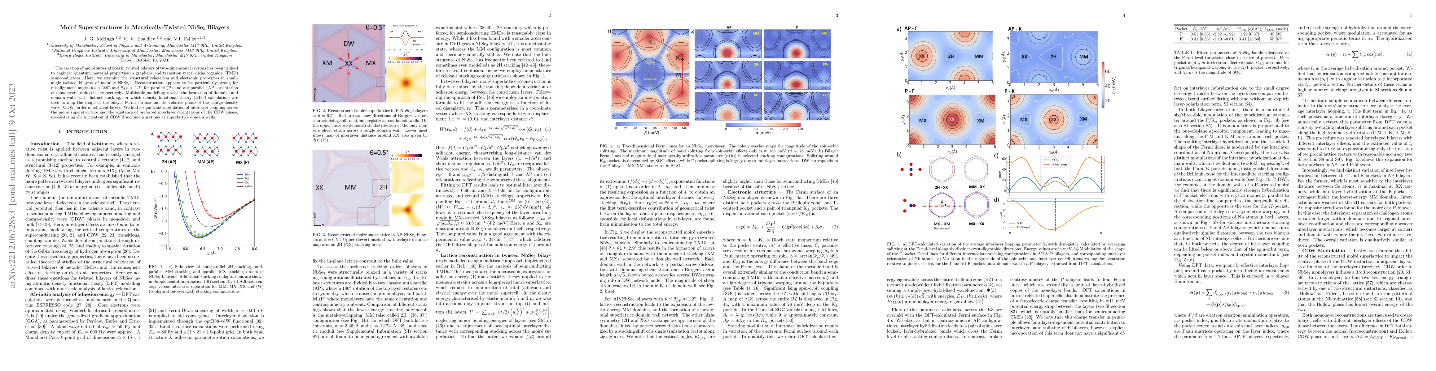 The creation of moir\'e superlattices in twisted bilayers of two-dimensional crystals has been utilised to engineer quantum material properties in graphene and transition metal dichalcogenide (TMD) semiconductors. Here, we examine the structural relaxation and electronic properties in small-angle twisted bilayers of metallic NbSe$_2$. Reconstruction appears to be particularly strong for misalignment angles $\theta_P$ < 2.9$^o$ and $\theta_{AP}$ < 1.2$^o$ for parallel (P) and antiparallel (AP) orientation of monolayers' unit cells, respectively. Multiscale modelling reveals the formation of domains and domain walls with distinct stacking, for which density functional theory (DFT) calculations are used to map the shape of the bilayer Fermi surface and the relative phase of the CDW order in adjacent layers. We find a significant modulation of interlayer coupling across the moir\'e superstructure and the existence of preferred interlayer orientations of the CDW phase, necessitating the nucleation of CDW discommensurations at superlattice domain walls.