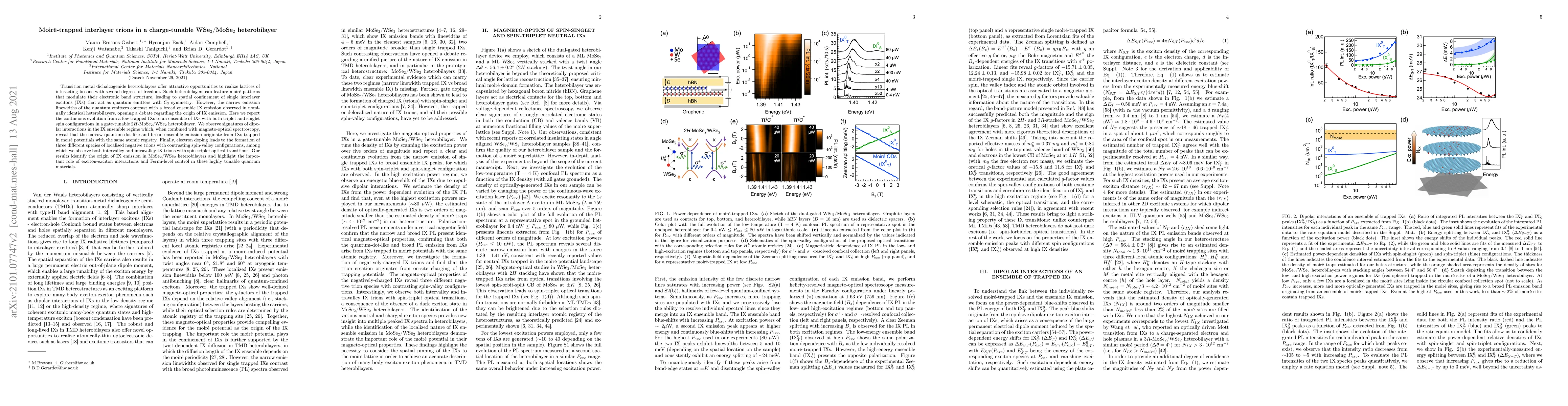 Transition metal dichalcogenide heterobilayers offer attractive opportunities to realize lattices of interacting bosons with several degrees of freedom. Such heterobilayers can feature moir\'e patterns that modulate their electronic band structure, leading to spatial confinement of single interlayer excitons (IXs) that act as quantum emitters with $C_3$ symmetry. However, the narrow emission linewidths of the quantum emitters contrast with a broad ensemble IX emission observed in nominally identical heterobilayers, opening a debate regarding the origin of IX emission. Here we report the continuous evolution from a few trapped IXs to an ensemble of IXs with both triplet and singlet spin configurations in a gate-tunable $2H$-MoSe$_2$/WSe$_2$ heterobilayer. We observe signatures of dipolar interactions in the IX ensemble regime which, when combined with magneto-optical spectroscopy, reveal that the narrow quantum-dot-like and broad ensemble emission originate from IXs trapped in moir\'e potentials with the same atomic registry. Finally, electron doping leads to the formation of three different species of localised negative trions with contrasting spin-valley configurations, among which we observe both intervalley and intravalley IX trions with spin-triplet optical transitions. Our results identify the origin of IX emission in MoSe$_2$/WSe$_2$ heterobilayers and highlight the important role of exciton-exciton interactions and Fermi-level control in these highly tunable quantum materials.