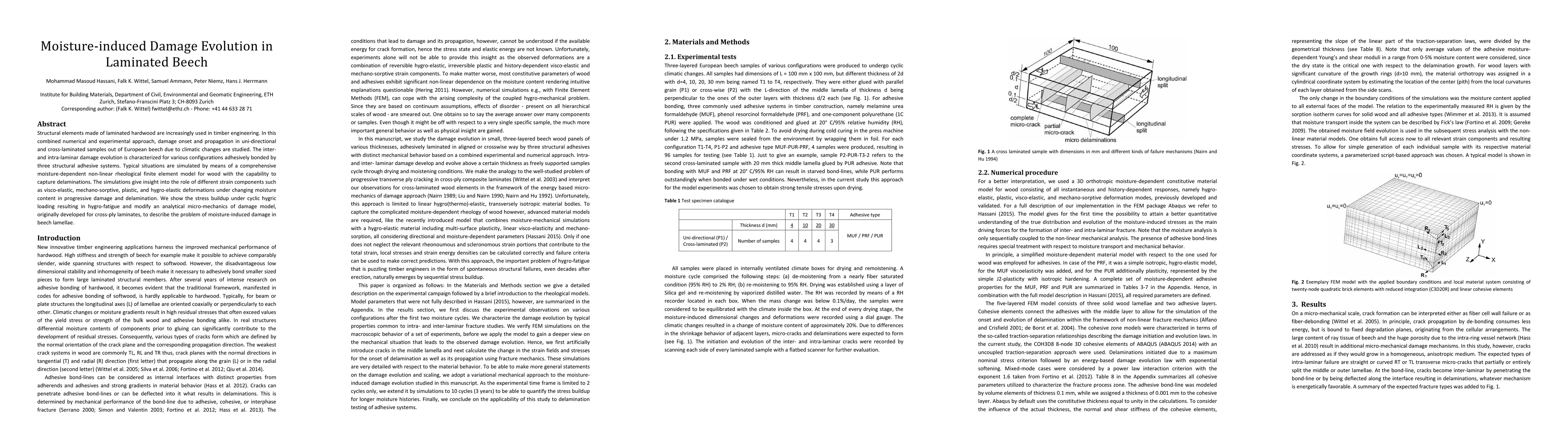 This study combines numerical and experimental methods to investigate moisture-induced damage in laminated beech wood, focusing on damage onset and propagation in different configurations bonded with various adhesives. The research employs a comprehensive moisture-dependent finite element model to simulate the effects of hygro-fatigue and modify a micro-mechanics damage model to better describe the damage in beech lamellae.