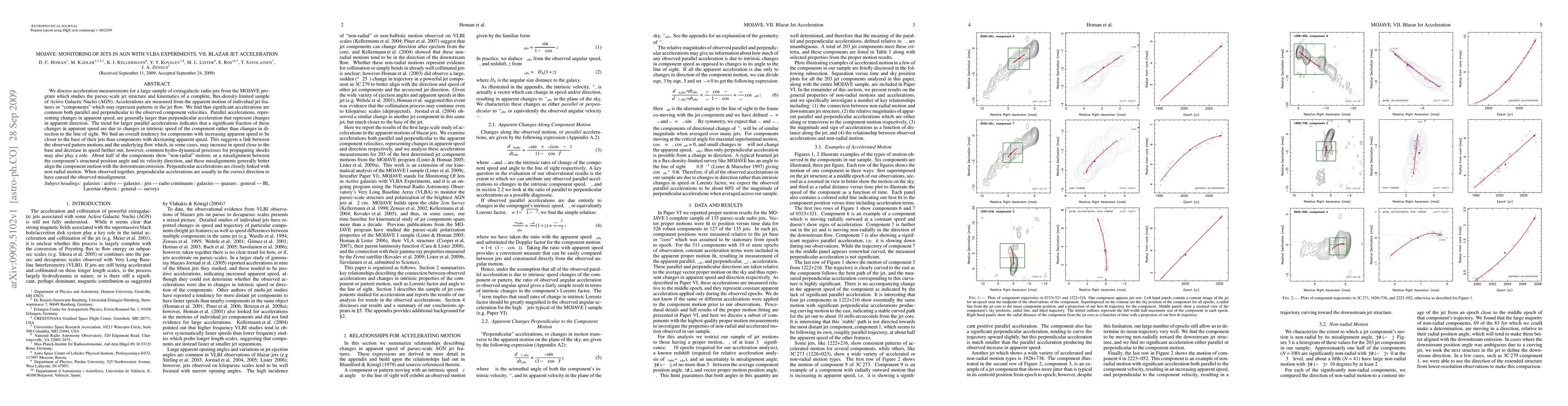 We discuss acceleration measurements for a large sample of extragalactic radio jets from the MOJAVE program which studies the parsec-scale jet structure and kinematics of a complete, flux-density-limited sample of Active Galactic Nuclei (AGN). Accelerations are measured from the apparent motion of individual jet features or "components" which may represent patterns in the jet flow. We find that significant accelerations are common both parallel and perpendicular to the observed component velocities. Parallel accelerations, representing changes in apparent speed, are generally larger than perpendicular acceleration that represent changes in apparent direction. The trend for larger parallel accelerations indicates that a significant fraction of these changes in apparent speed are due to changes in intrinsic speed of the component rather than changes in direction to the line of sight. We find an overall tendency for components with increasing apparent speed to be closer to the base of their jets than components with decreasing apparent speed. This suggests a link between the observed pattern motions and the underlying flow which, in some cases, may increase in speed close to the base and decrease in speed further out; however, common hydro-dynamical processes for propagating shocks may also play a role. About half of the components show "non-radial" motion, or a misalignment between the component's structural position angle and its velocity direction, and these misalignments generally better align the component motion with the downstream emission. Perpendicular accelerations are closely linked with non-radial motion. When observed together, perpendicular accelerations are usually in the correct direction to have caused the observed misalignment.
