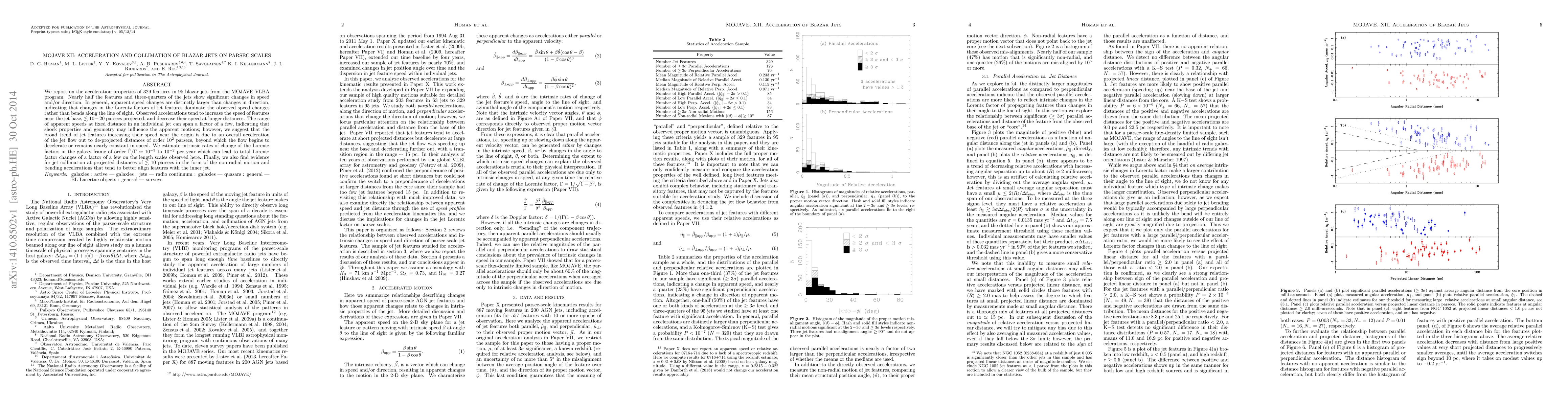 We report on the acceleration properties of 329 features in 95 blazar jets from the MOJAVE VLBA program. Nearly half the features and three-quarters of the jets show significant changes in speed and/or direction. In general, apparent speed changes are distinctly larger than changes in direction, indicating that changes in the Lorentz factors of jet features dominate the observed speed changes rather than bends along the line of sight. Observed accelerations tend to increase the speed of features near the jet base, $\lesssim 10-20$ parsecs projected, and decrease their speed at longer distances. The range of apparent speeds at fixed distance in an individual jet can span a factor of a few, indicating that shock properties and geometry may influence the apparent motions; however, we suggest that the broad trend of jet features increasing their speed near the origin is due to an overall acceleration of the jet flow out to de-projected distances of order $10^2$ parsecs, beyond which the flow begins to decelerate or remains nearly constant in speed. We estimate intrinsic rates of change of the Lorentz factors in the galaxy frame of order $\dot{\Gamma}/\Gamma \simeq 10^{-3}$ to $10^{-2}$ per year which can lead to total Lorentz factor changes of a factor of a few on the length scales observed here. Finally, we also find evidence for jet collimation at projected distances of $\lesssim 10$ parsecs in the form of the non-radial motion and bending accelerations that tend to better align features with the inner jet.