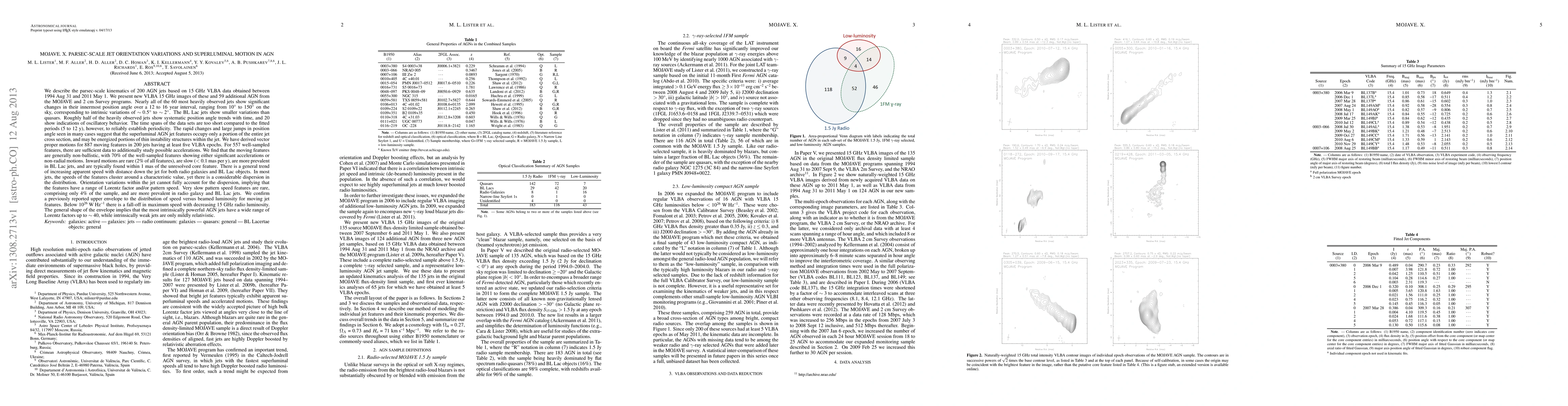 This study analyzes the parsec-scale kinematics of 200 AGN jets using 15 GHz VLBA data, revealing significant variations in jet orientation over 12 to 16 years. The findings suggest that superluminal features may arise from thin instability structures within the jets, with most moving features exhibiting non-ballistic behavior and accelerations.
