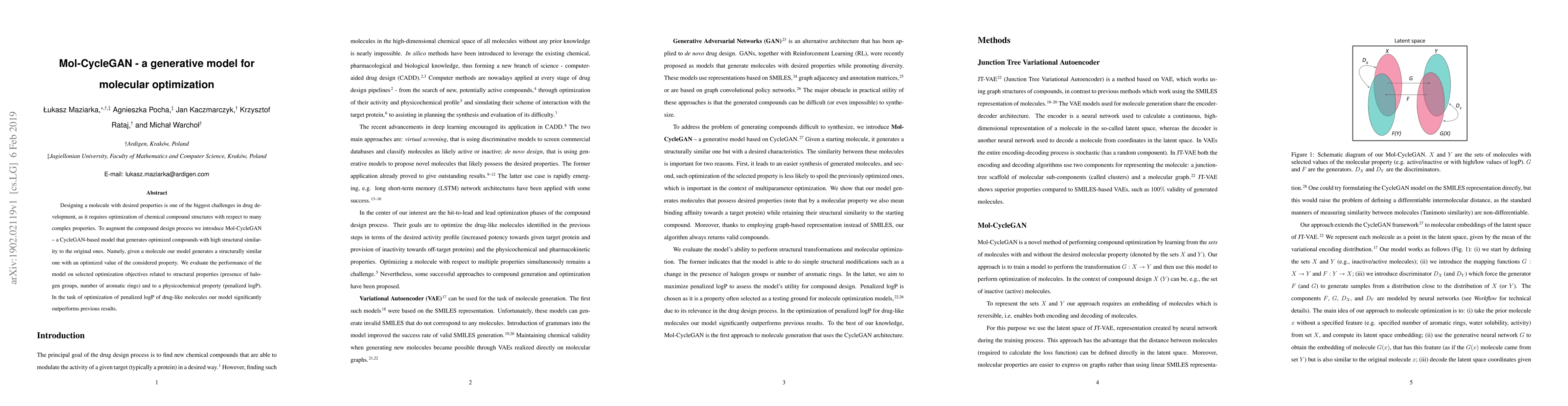 Designing a molecule with desired properties is one of the biggest challenges in drug development, as it requires optimization of chemical compound structures with respect to many complex properties. To augment the compound design process we introduce Mol-CycleGAN - a CycleGAN-based model that generates optimized compounds with high structural similarity to the original ones. Namely, given a molecule our model generates a structurally similar one with an optimized value of the considered property. We evaluate the performance of the model on selected optimization objectives related to structural properties (presence of halogen groups, number of aromatic rings) and to a physicochemical property (penalized logP). In the task of optimization of penalized logP of drug-like molecules our model significantly outperforms previous results.