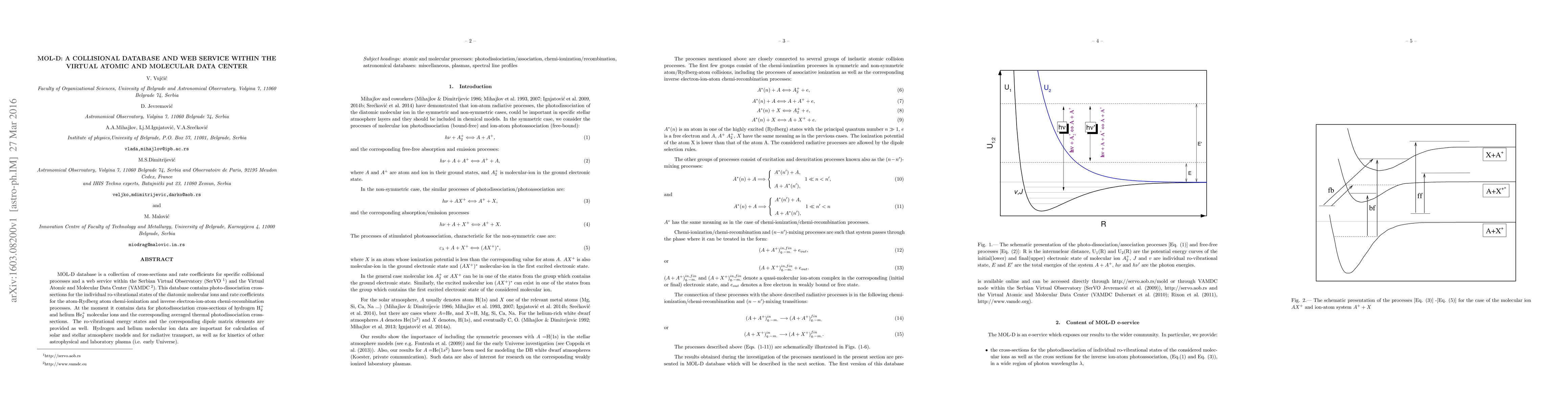 MOL-D is a database offering collisional data and a web service for photo-dissociation cross-sections and rate coefficients, crucial for astrophysical and plasma physics models, including hydrogen H2+ and helium He2+ molecular ions. It supports solar and stellar atmospheric calculations and radiative transport studies.