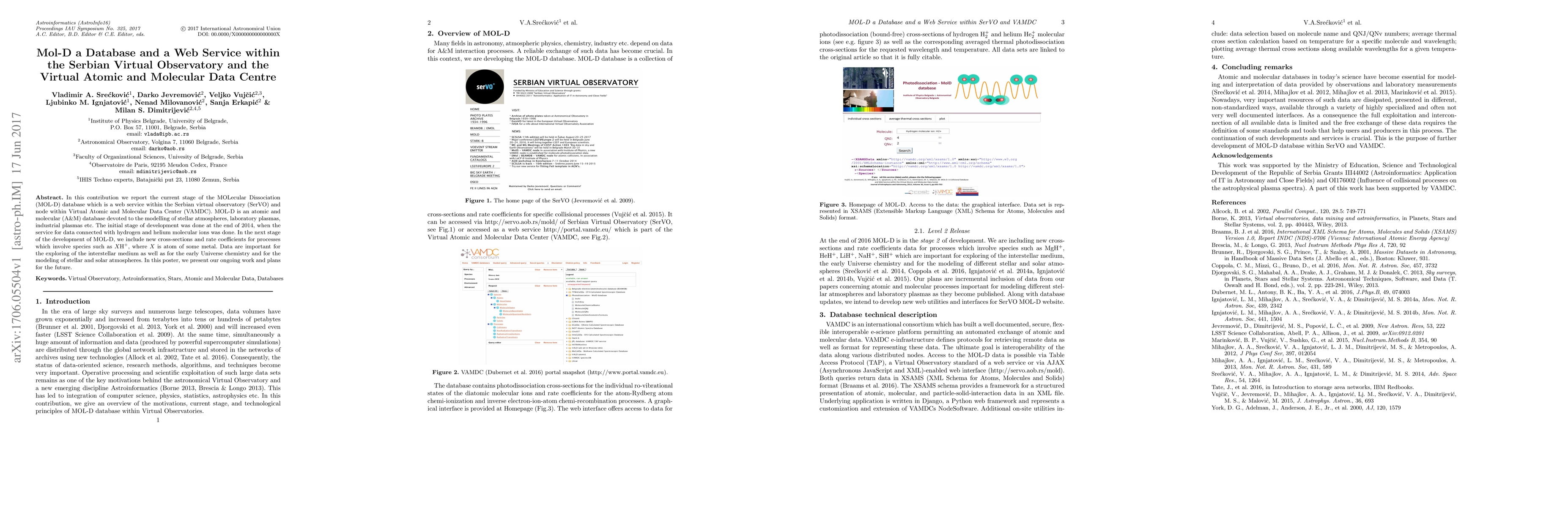 The MOL-D database, part of the Serbian Virtual Observatory and VAMDC, focuses on atomic and molecular data for modeling stellar atmospheres and plasmas. Initially developed in late 2014 for hydrogen and helium molecular ions, it now plans to expand with new cross-sections and rate coefficients for metal-containing species, aiding in interstellar medium and early Universe chemistry research.