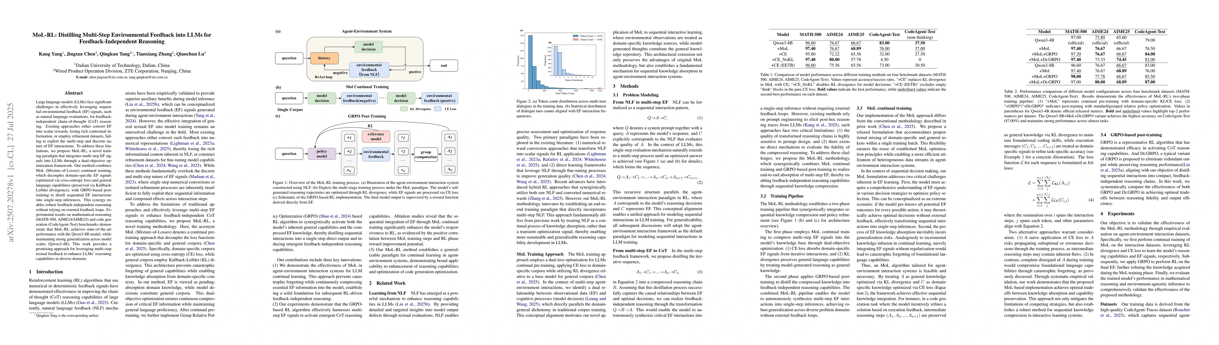Large language models (LLMs) face significant challenges in effectively leveraging sequential environmental feedback (EF) signals, such as natural language evaluations, for feedback-independent chain-of-thought (CoT) reasoning. Existing approaches either convert EF into scalar rewards, losing rich contextual information, or employ refinement datasets, failing to exploit the multi-step and discrete nature of EF interactions. To address these limitations, we propose MoL-RL, a novel training paradigm that integrates multi-step EF signals into LLMs through a dual-objective optimization framework. Our method combines MoL (Mixture-of-Losses) continual training, which decouples domain-specific EF signals (optimized via cross-entropy loss) and general language capabilities (preserved via Kullback-Leibler divergence), with GRPO-based post-training to distill sequential EF interactions into single-step inferences. This synergy enables robust feedback-independent reasoning without relying on external feedback loops. Experimental results on mathematical reasoning (MATH-500, AIME24/AIME25) and code generation (CodeAgent-Test) benchmarks demonstrate that MoL-RL achieves state-of-the-art performance with the Qwen3-8B model, while maintaining strong generalization across model scales (Qwen3-4B). This work provides a promising approach for leveraging multi-step textual feedback to enhance LLMs' reasoning capabilities in diverse domains.