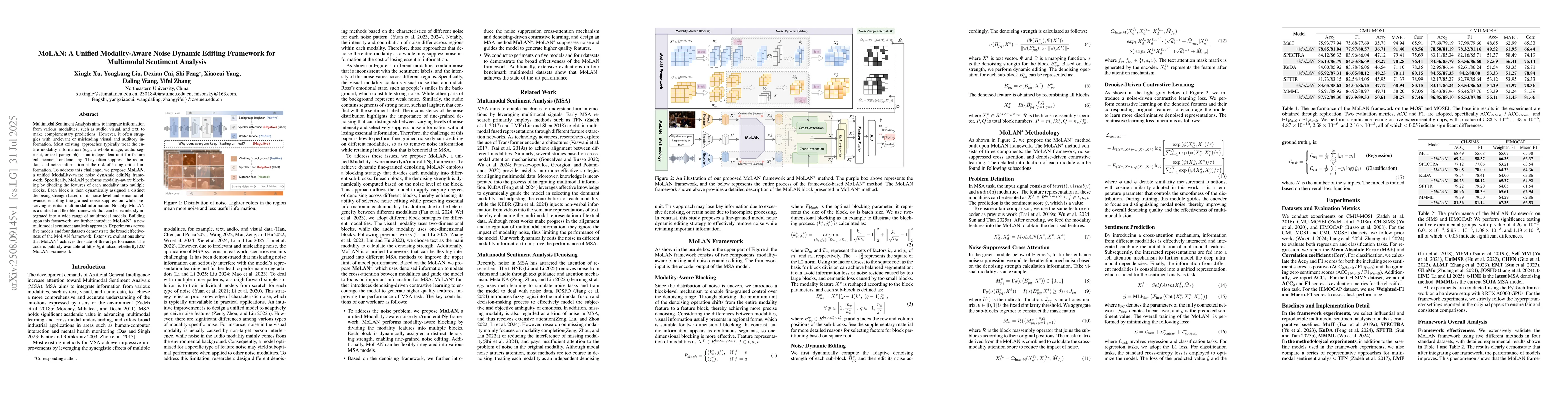 Multimodal Sentiment Analysis aims to integrate information from various modalities, such as audio, visual, and text, to make complementary predictions. However, it often struggles with irrelevant or misleading visual and auditory information. Most existing approaches typically treat the entire modality information (e.g., a whole image, audio segment, or text paragraph) as an independent unit for feature enhancement or denoising. They often suppress the redundant and noise information at the risk of losing critical information. To address this challenge, we propose MoLAN, a unified ModaLity-aware noise dynAmic editiNg framework. Specifically, MoLAN performs modality-aware blocking by dividing the features of each modality into multiple blocks. Each block is then dynamically assigned a distinct denoising strength based on its noise level and semantic relevance, enabling fine-grained noise suppression while preserving essential multimodal information. Notably, MoLAN is a unified and flexible framework that can be seamlessly integrated into a wide range of multimodal models. Building upon this framework, we further introduce MoLAN+, a new multimodal sentiment analysis approach. Experiments across five models and four datasets demonstrate the broad effectiveness of the MoLAN framework. Extensive evaluations show that MoLAN+ achieves the state-of-the-art performance. The code is publicly available at https://github.com/betterfly123/MoLAN-Framework.