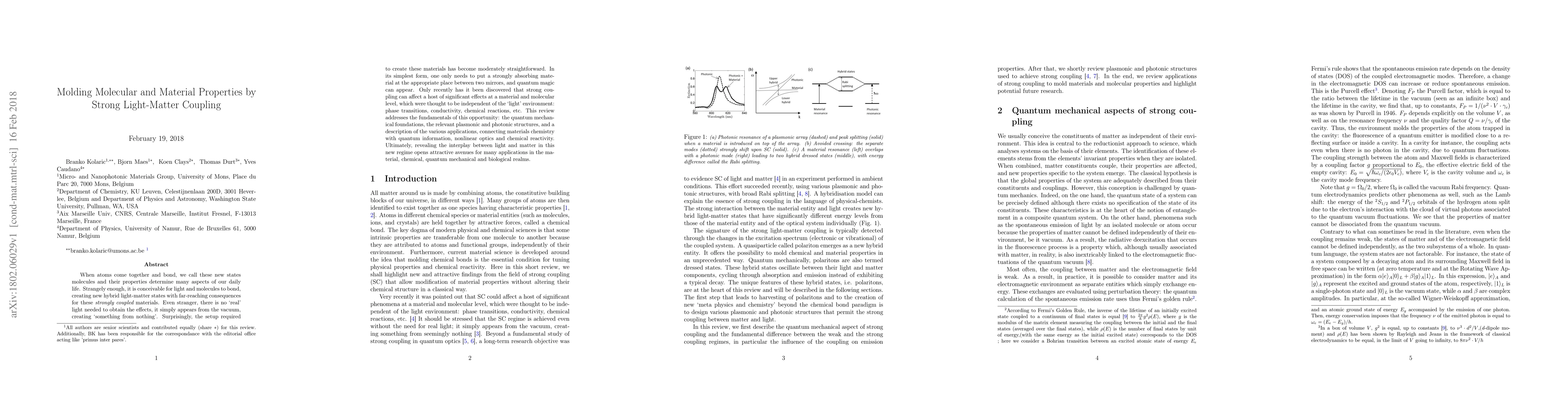 When atoms come together and bond, we call these new states molecules, and their properties determine many aspects of our daily life. Strangely enough, it is conceivable for light and molecules to bond, creating new hybrid light-matter states with far-reaching consequences for these strongly coupled materials. Even stranger, there is no `real' light needed to obtain the effects, it simply appears from the vacuum, creating `something from nothing'. Surprisingly, the setup required to create these materials has become moderately straightforward. In its simplest form, one only needs to put a strongly absorbing material at the appropriate place between two mirrors, and quantum magic can appear. Only recently has it been discovered that strong coupling can affect a host of significant effects at a material and molecular level, which were thought to be independent of the `light' environment: phase transitions, conductivity, chemical reactions, etc. This review addresses the fundamentals of this opportunity: the quantum mechanical foundations, the relevant plasmonic and photonic structures, and a description of the various applications, connecting materials chemistry with quantum information, nonlinear optics and chemical reactivity. Ultimately, revealing the interplay between light and matter in this new regime opens attractive avenues for many applications in the material, chemical, quantum mechanical and biological realms.