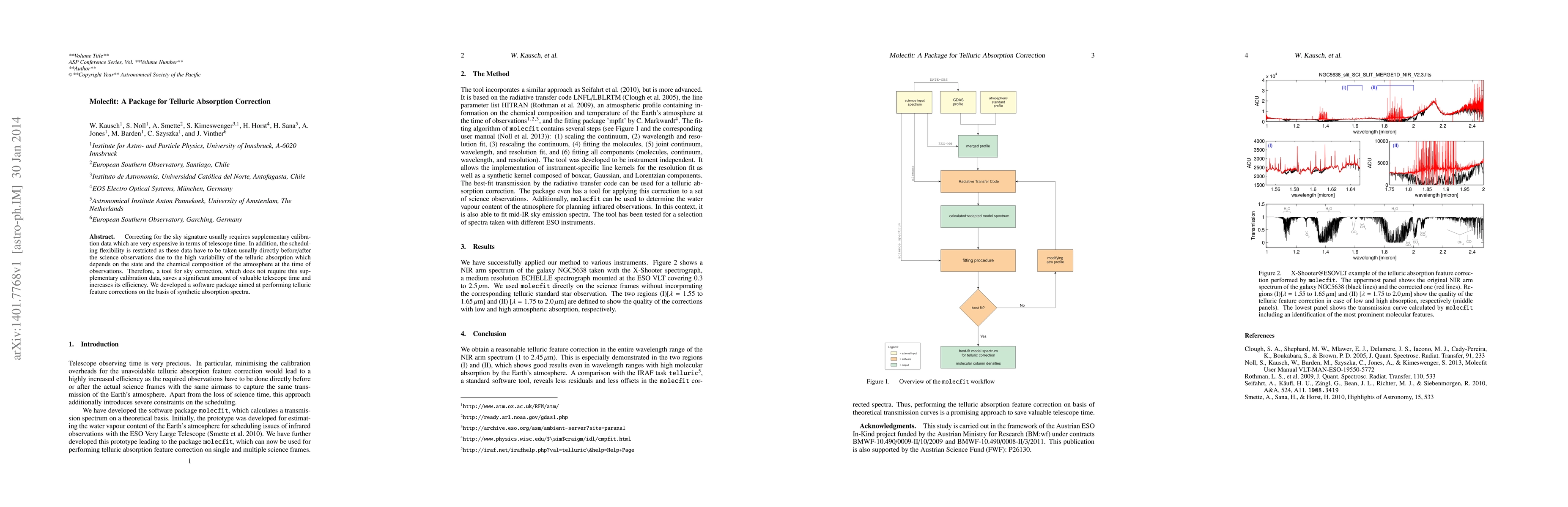Title: Molecfit: A Package for Telluric Absorption Correction Summary: Molecfit offers a method to correct telluric absorption without needing supplementary calibration data, saving telescope time and improving efficiency through synthetic absorption spectra.