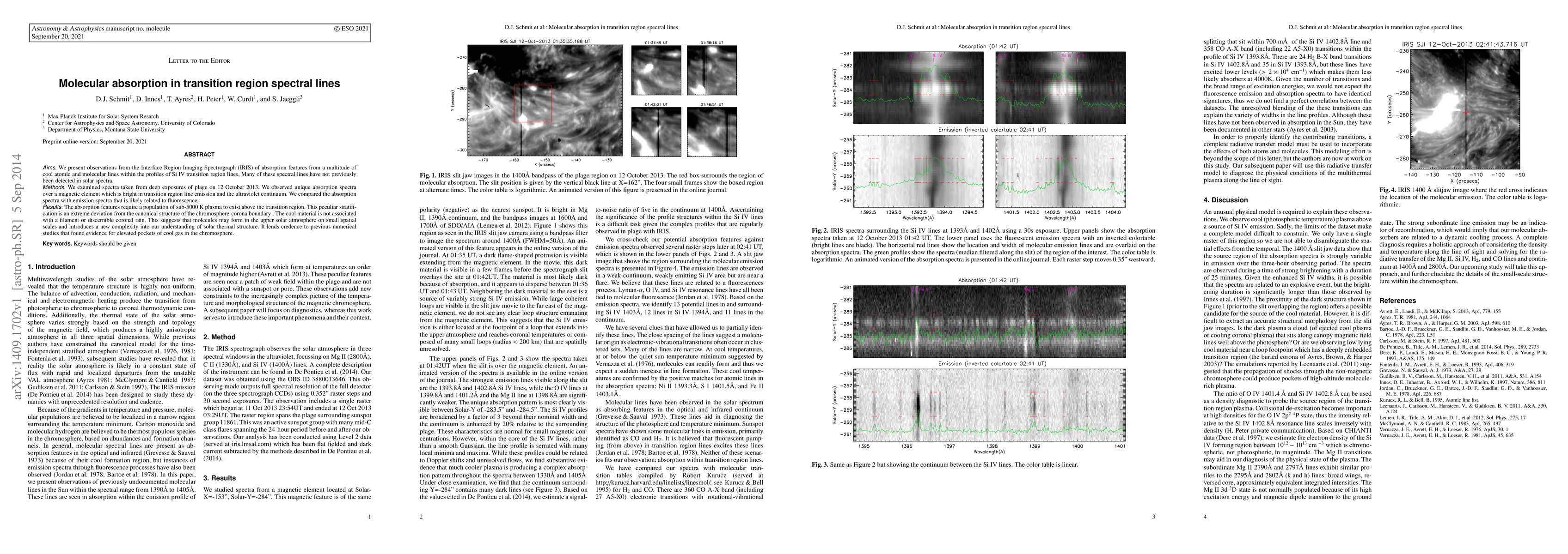 This study uses IRIS observations to detect previously unseen molecular absorption features in Si IV lines, indicating the presence of cool plasma above the transition region. These findings suggest that molecules can form in the upper solar atmosphere on small scales, challenging traditional solar thermal structure models.