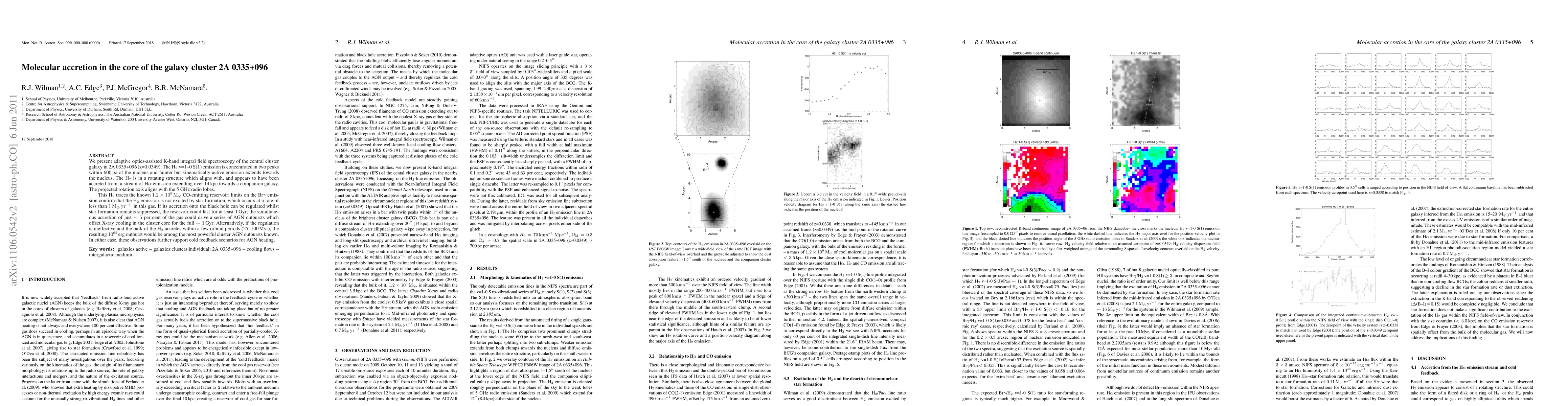 This study uses adaptive optics and K-band spectroscopy to examine the galaxy cluster 2A 0335+096's core, finding molecular hydrogen (H2) gas in a rotating structure linked to a companion galaxy. The H2, which isn't star formation-excited, could fuel an active galactic nucleus (AGN) for over a gigayear, either steadily or in powerful bursts, supporting cold feedback scenarios for AGN heating in cluster cores.