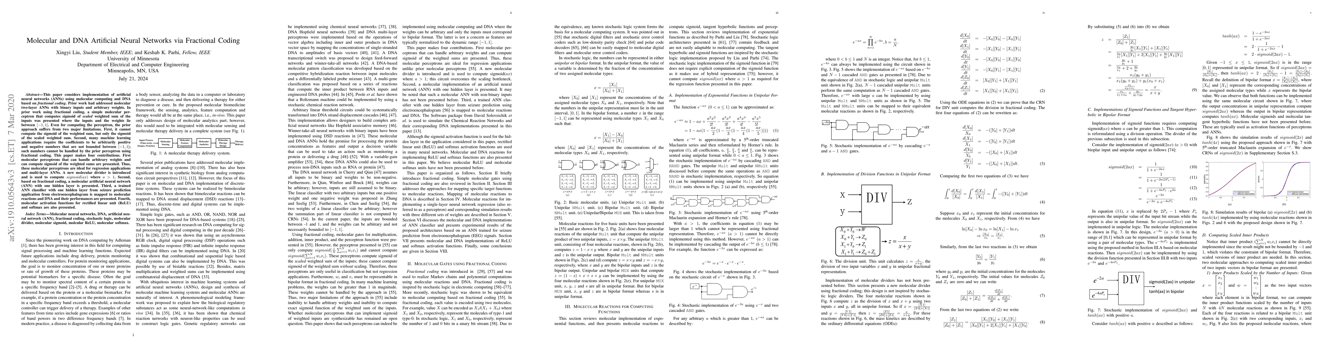 This paper considers implementation of artificial neural networks (ANNs) using molecular computing and DNA based on fractional coding. Prior work had addressed molecular two-layer ANNs with binary inputs and arbitrary weights. In prior work using fractional coding, a simple molecular perceptron that computes sigmoid of scaled weighted sum of the inputs was presented where the inputs and the weights lie between [-1, 1]. Even for computing the perceptron, the prior approach suffers from two major limitations. First, it cannot compute the sigmoid of the weighted sum, but only the sigmoid of the scaled weighted sum. Second, many machine learning applications require the coefficients to be arbitrarily positive and negative numbers that are not bounded between [-1, 1]; such numbers cannot be handled by the prior perceptron using fractional coding. This paper makes four contributions. First molecular perceptrons that can handle arbitrary weights and can compute sigmoid of the weighted sums are presented. Thus, these molecular perceptrons are ideal for regression applications and multi-layer ANNs. A new molecular divider is introduced and is used to compute sigmoid(ax) where a > 1. Second, based on fractional coding, a molecular artificial neural network (ANN) with one hidden layer is presented. Third, a trained ANN classifier with one hidden layer from seizure prediction application from electroencephalogram is mapped to molecular reactions and DNA and their performances are presented. Fourth, molecular activation functions for rectified linear unit (ReLU) and softmax are also presented.