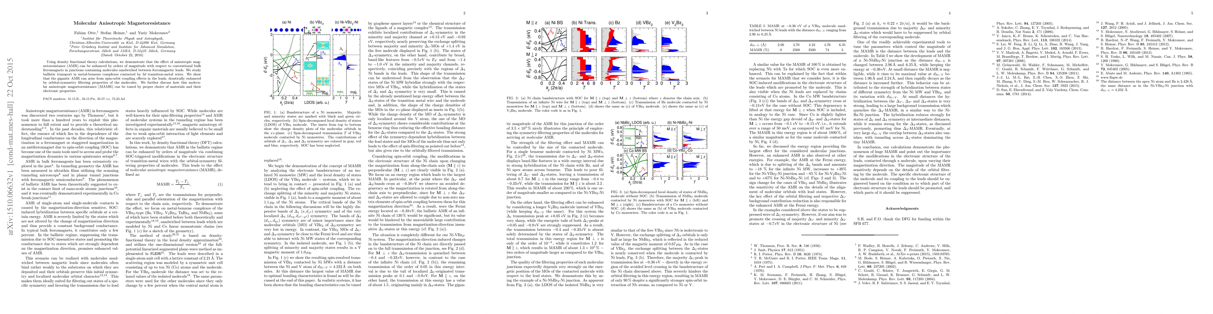 This paper demonstrates that molecular anisotropic magnetoresistance (MAMR) can be significantly enhanced in junctions with molecules between ferromagnetic leads, using density functional theory. The study shows that MAMR arises from spin-orbit coupling and is greatly amplified by the orbital-symmetry filtering of the molecules, suggesting tunable properties through material selection.