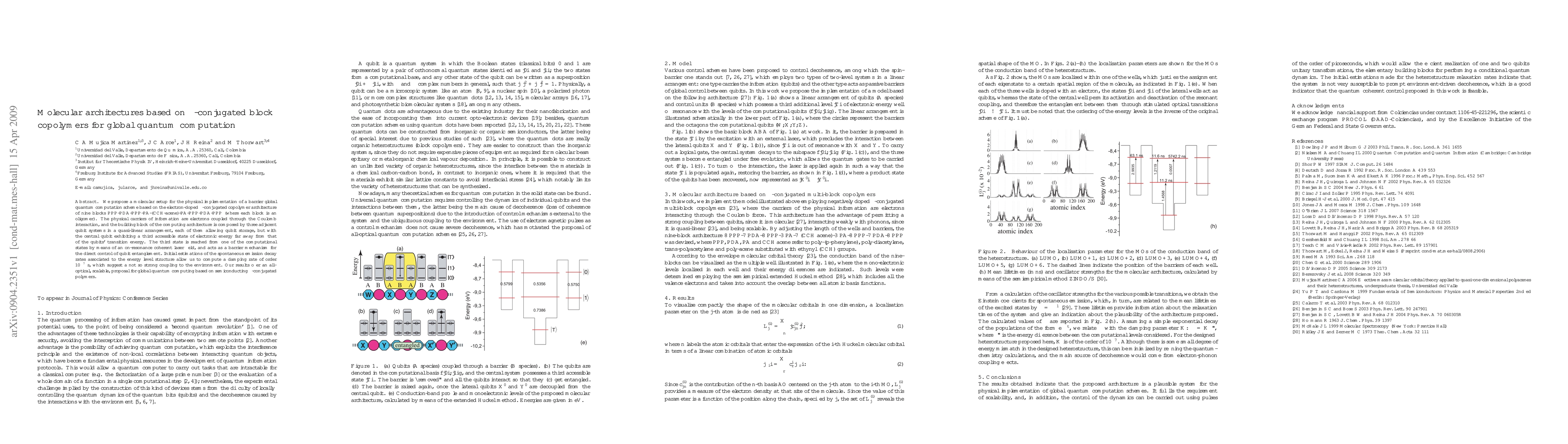 This paper proposes a molecular architecture using pi-conjugated block copolymers for global quantum computation, utilizing electron-doped oligomers to implement a barrier scheme. The setup features a quasi-linear arrangement of three qubit systems, with a central qubit having a third accessible state controlled by a coherent laser field, enabling qubit entanglement control.