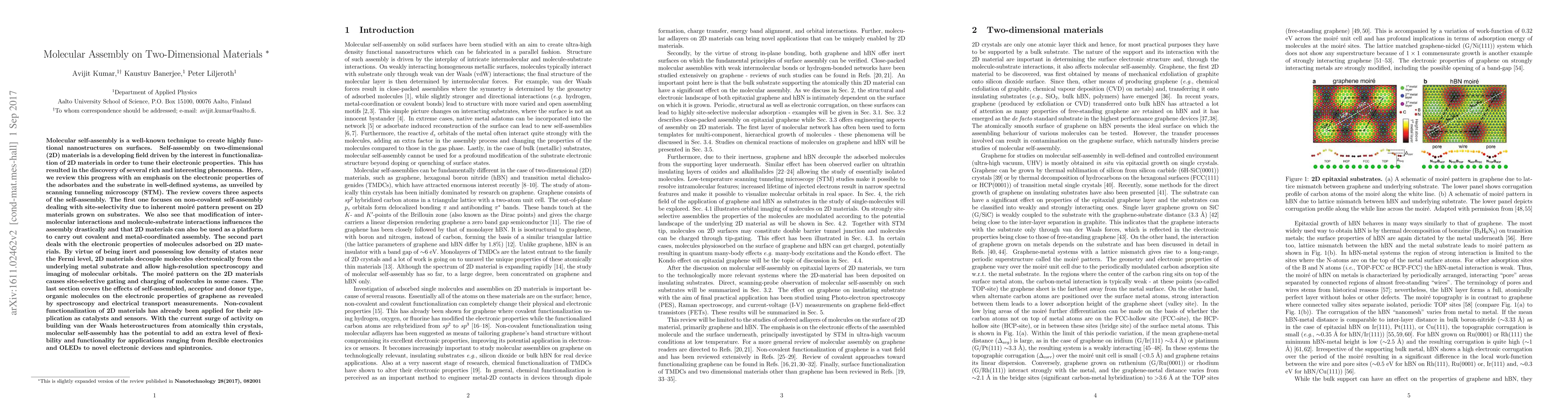 This paper reviews advancements in molecular self-assembly on two-dimensional materials, emphasizing electronic properties observed via scanning tunneling microscopy. It highlights non-covalent self-assembly and its site-selectivity, the decoupling of molecules by 2D materials, and the influence of moiré patterns on electronic properties, with potential applications in flexible electronics and novel devices.