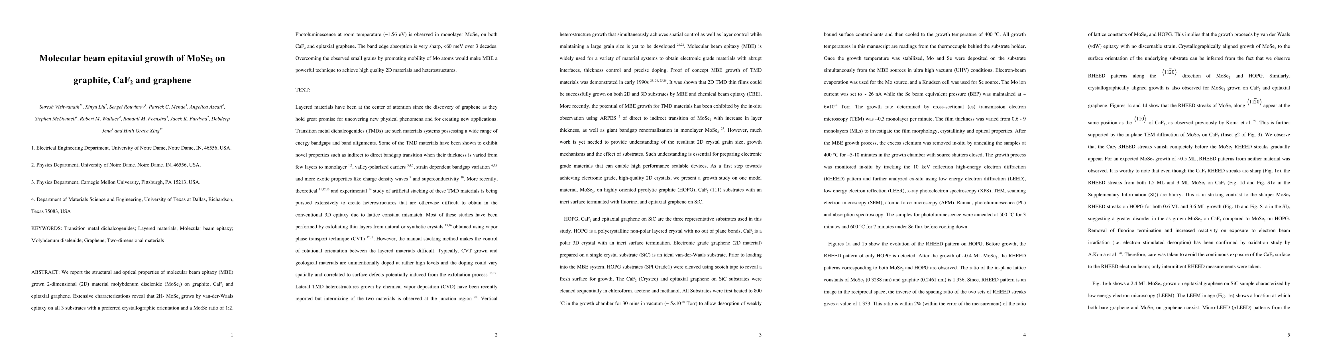 This paper investigates the molecular beam epitaxial growth of MoSe2 on graphite, CaF2, and graphene, revealing van-der-Waals epitaxy with a 2H-MoSe2 structure and sharp band edge absorption. Photoluminescence at room temperature is observed in monolayer MoSe2 on CaF2 and graphene, highlighting the potential of MBE for high-quality 2D material heterostructures.