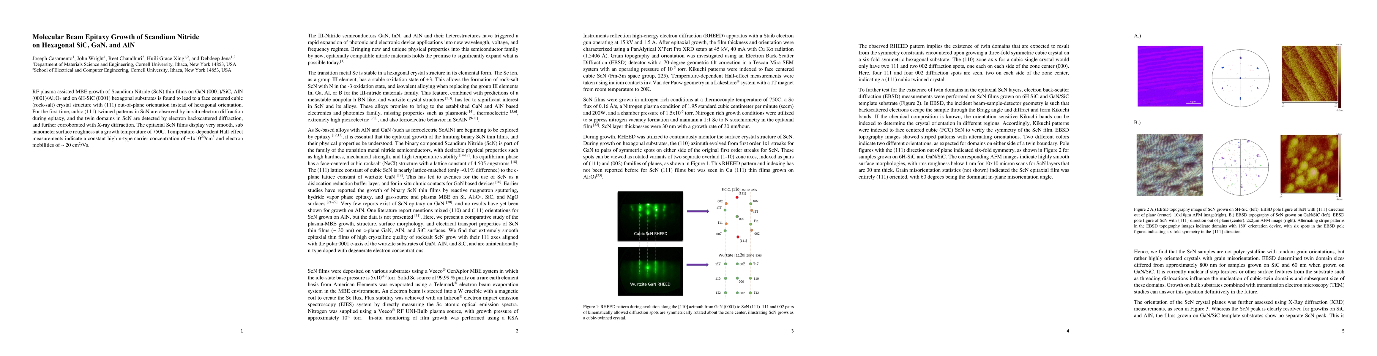 This study explores the RF plasma assisted MBE growth of ScN thin films on various hexagonal substrates, revealing a face-centered cubic (rock-salt) crystal structure with (111) orientation, contrary to expected hexagonal. The films exhibit smooth surfaces and high n-type carrier concentration and electron mobility.