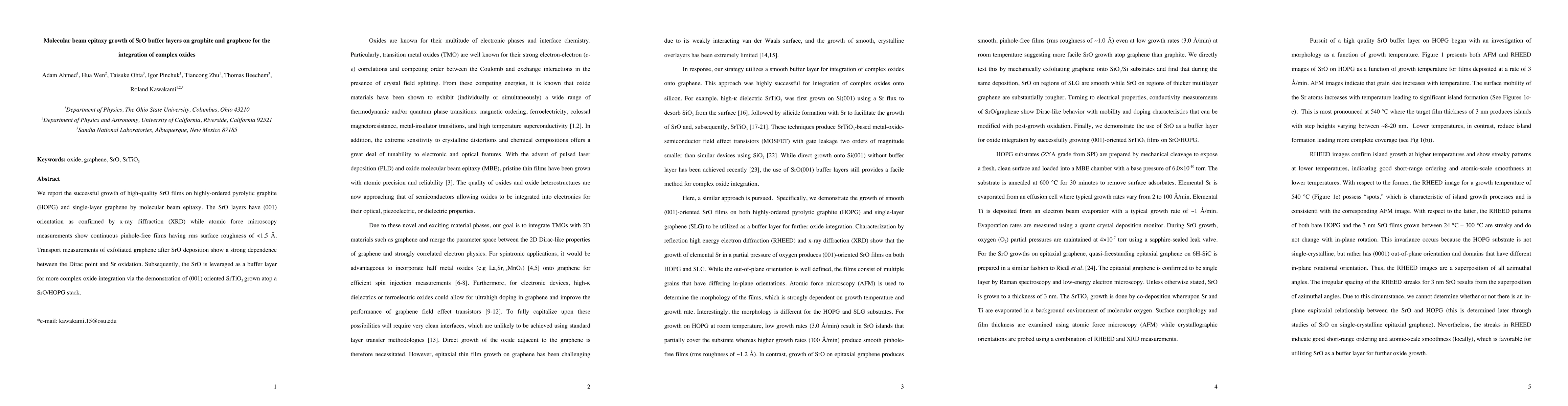 This paper reports the successful growth of high-quality SrO buffer layers on graphite and graphene using molecular beam epitaxy, achieving (001) orientation with minimal surface roughness. The SrO layers enable the integration of complex oxides, such as SrTiO3, demonstrating their potential for advanced oxide heterostructures.
