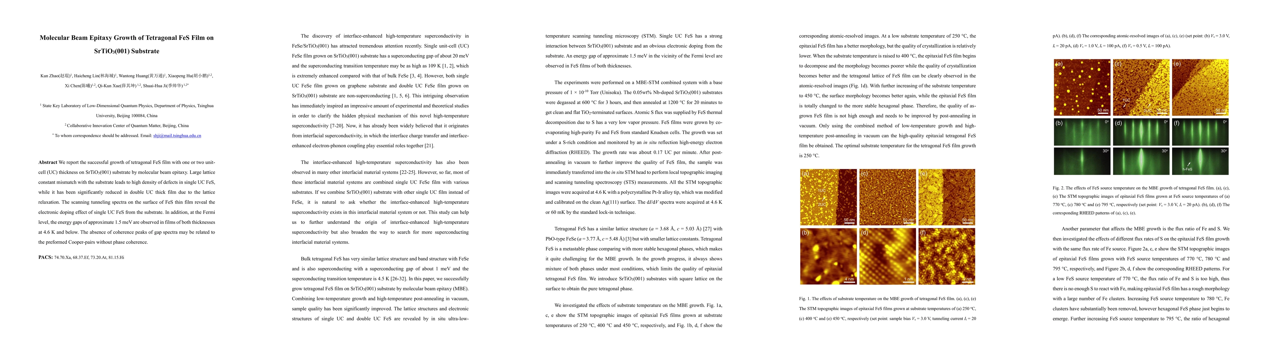 This paper details the molecular beam epitaxy growth of tetragonal FeS films on SrTiO3(001) substrates, showing high defect density in single-unit-cell films reduced in double-unit-cell layers due to lattice relaxation. Scanning tunneling spectra reveal electronic doping from the substrate, and energy gaps of ~1.5 meV are observed at low temperatures, suggesting preformed Cooper-pairs without phase coherence.